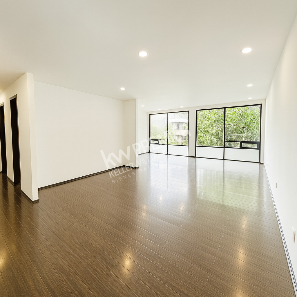 Este amplio departamento exterior te recibe con una estancia sala-comedor bañada de luz natural, gracias a sus grandes ventanales que ofrecen una vista arbolada, creando un ambiente cálido y acogedor. El piso laminado y la distribución inteligente del espacio hacen que cada rincón sea funcional y estético.