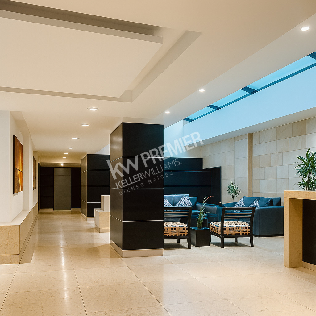 - Lobby elegante: Con acabados en mármol y madera, recepción y sala de visitas.