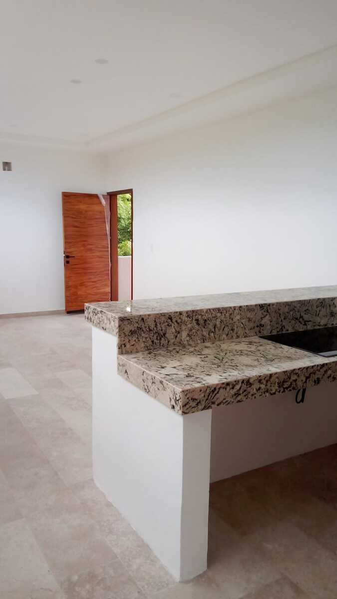 Cocina con tarja profunda, equipada con carpintería inferior y superior, parrilla de inducción, cubierta de marmol Grisnal