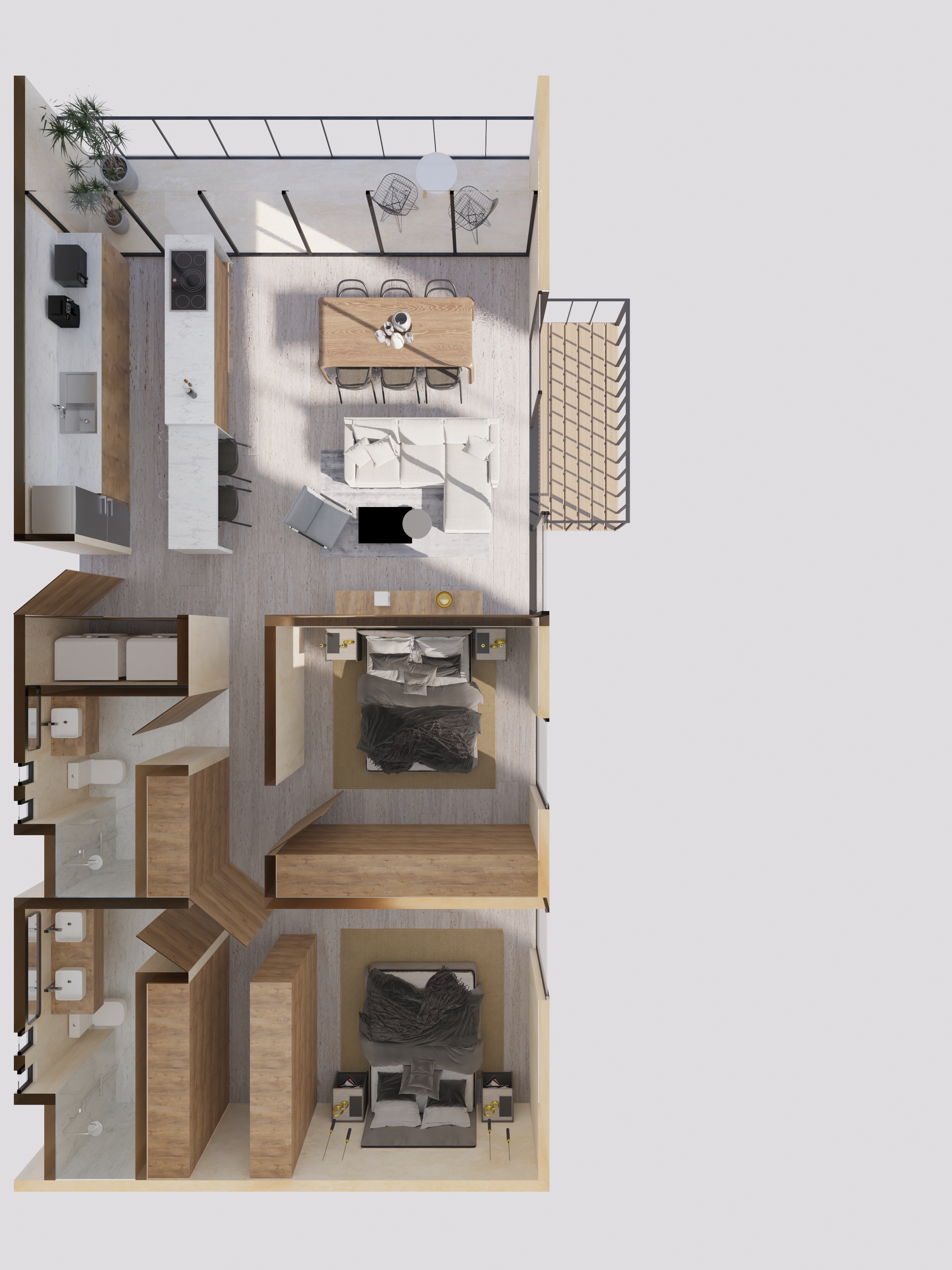 -Terrazas (una de 3.03 m2 y otra de 7.00 m2), proporcionando una transición armoniosa entre el interior y el exterior del departamento.