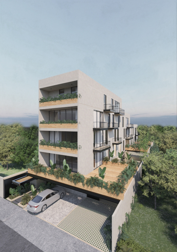 O "Conjunto de Apartamentos KA’AX" é um desenvolvimento residencial que consiste em um total de 9 apartamentos distribuídos em quatro níveis, localizado na área privilegiada de Temozón Norte.