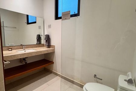 Banheiro completo e móvel e divisória fixa de banheiro