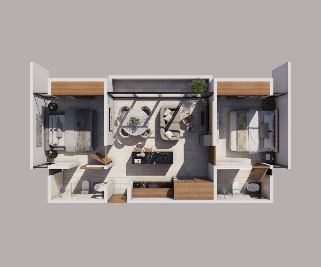 Cada departamento cuenta con espacios pensados para vivir cómodamente, con estilo, confort y conexión con su entorno. Acabados premium y amenidades que complementan tu estilo de vida.