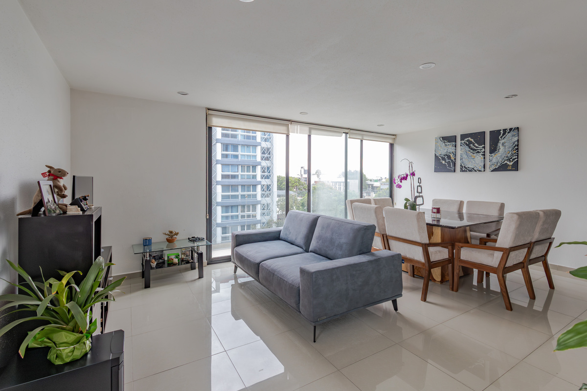 Este departamento en Narvarte Poniente ofrece una combinación perfecta de diseño, ubicación y confort. Con 109 m² y ventanales de piso a techo, cada espacio se aprovecha al máximo y se llena de luz natural. La cocina abierta con cubierta de granito se integra armoniosamente con la estancia, creando un ambiente moderno y funcional. A un costado, el área de lavado brinda practicidad sin afectar la estética del espacio. La estancia y la recámara principal tienen balcón, ideales para disfrutar del aire libre y la vista urbana. Cuenta con tres recámaras, tres baños completos y dos estacionamientos. El condominio ofrece roof garden común con asadores y baño, además de vigilancia 24/7, lo que garantiza seguridad y convivencia en un entorno agradable. Ubicado sobre Av. Eugenia, tendrás acceso rápido a vías principales, transporte, comercios, restaurantes y todo lo que hace de la Narvarte una de las colonias más atractivas para vivir. Un espacio moderno, iluminado y con una distribución ideal para quienes valoran la comodidad y el estilo. Agenda tu cita y conócelo.