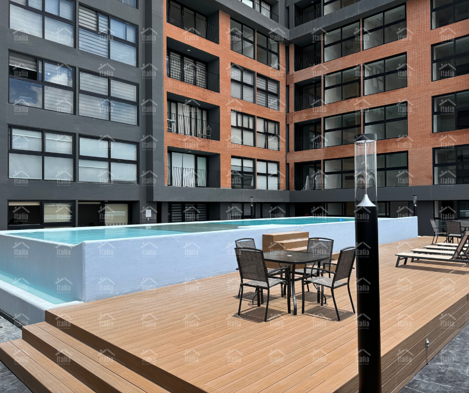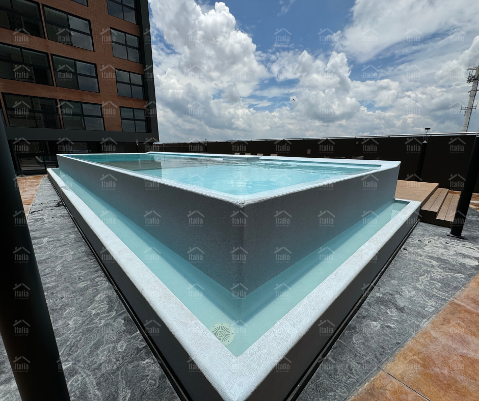 El conjunto cuenta con área de amenidades en la parte posterior, con una alberca que contarán con un sistema de calefacción por medio de una bomba de calor, unidas por un área de asoleadero húmedo. En este espacio se cuenta también con un área de terraza de lectura, baños, vestidores para hombres y mujeres, pista de jogging, juegos infantiles, aparatos de ejercicio al aire libre y sala techada.