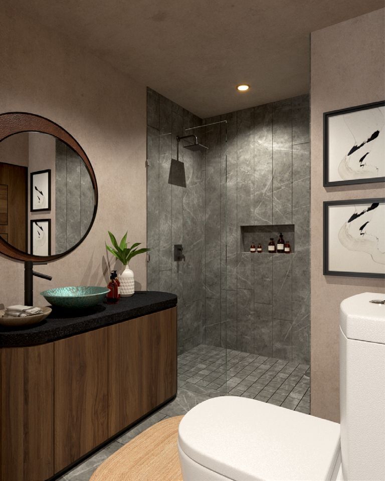 • Baños con canceles de vidrio templado, lavabos y tarja en color negro con monomando