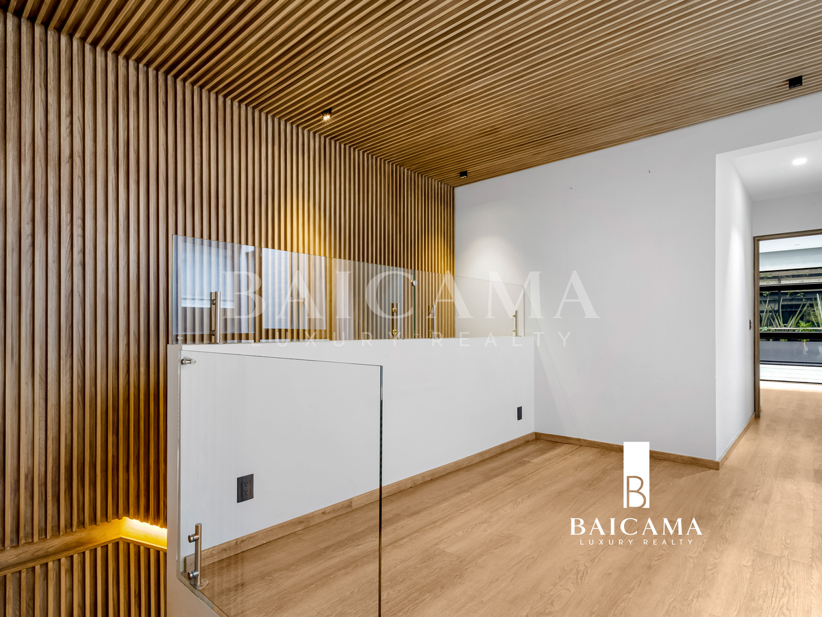 En la planta superior se encuentra un family room, dos recámaras secundarias, cada una con baño completo y vestidor. La recámara principal es un espacio amplio e iluminado, con un diseño que brinda privacidad y salida a una terraza con vista arbolada.