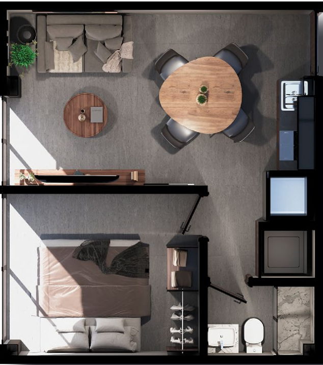 Los acabados incluyen pisos de porcelanato y canceles de baño en cristal templado. El desarrollo ofrece amenidades como recepción, seguridad 24/7, coworking, terraza con asadores, gimnasio y elevador. Ubicado cerca de servicios esenciales como tiendas, supermercados, escuelas, universidades, bancos y restaurantes. Excelente conectividad: a 8 min de La Minerva, 5 min de Plaza Midtown y Hospital San Javier