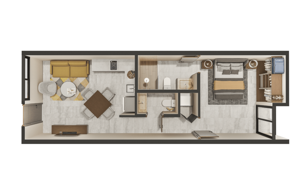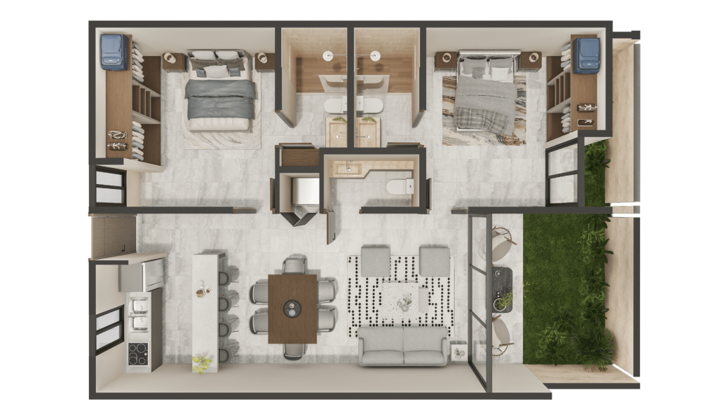 Equipamiento según modelo: Aires acondicionados sin instalar, calentador eléctrico, parrilla eléctrica, refrigerador, cama matrimonial, cabecera, burós, tv de 50” instalada, cortinas blackout en recámara y sala, microondas, sofá de 2 lugares para sala, mesa de centro para sala, clósets semivestidos, gaveteros inferiores en cocina, fijo de cristal en baños