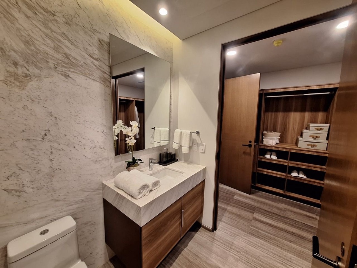 Con cocina, electrodomésticos, canceles, plafones, iluminación, climas vrf seccionados, carpintería y grifería (no incluye lavadora y secadora)