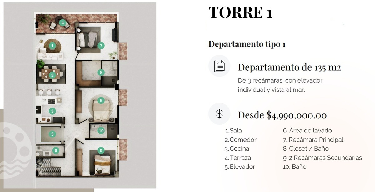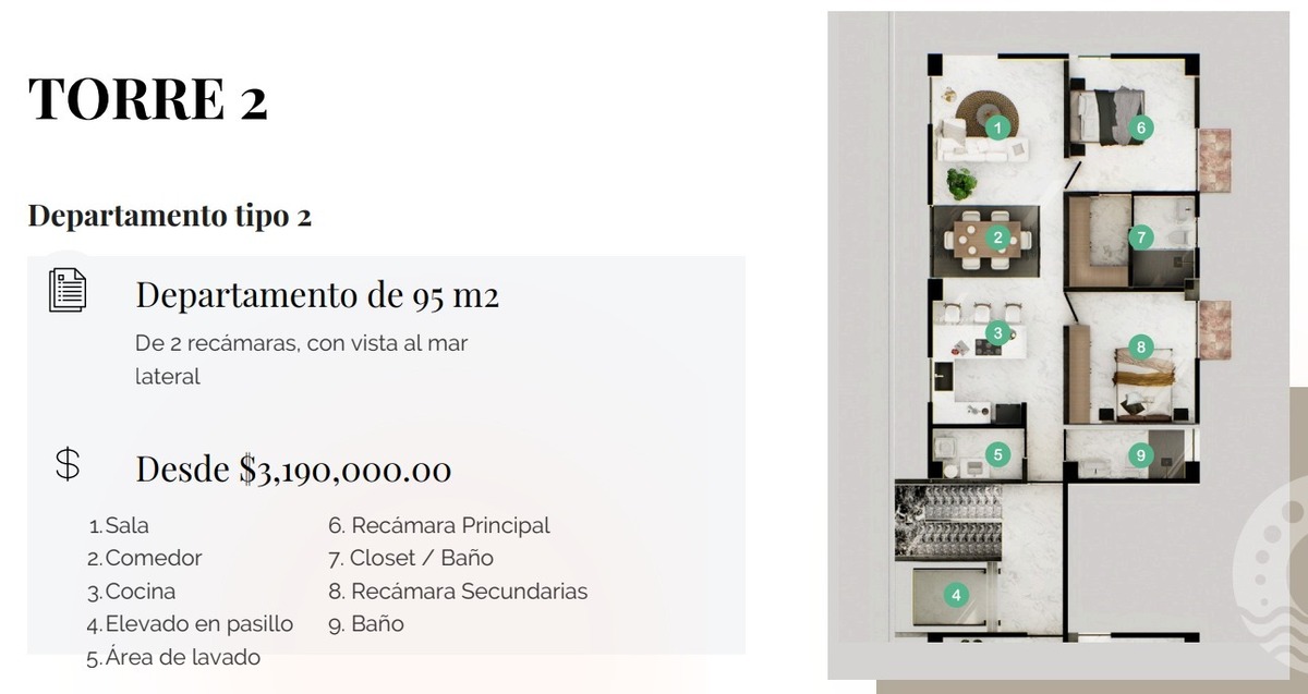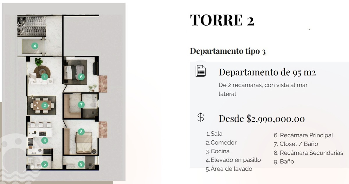 Departamentos desde 95 m2 hasta 135 m2, todos con un espacio de estacionamiento con opción a comprar otro. Cuenta con estacionamiento para visitas.
