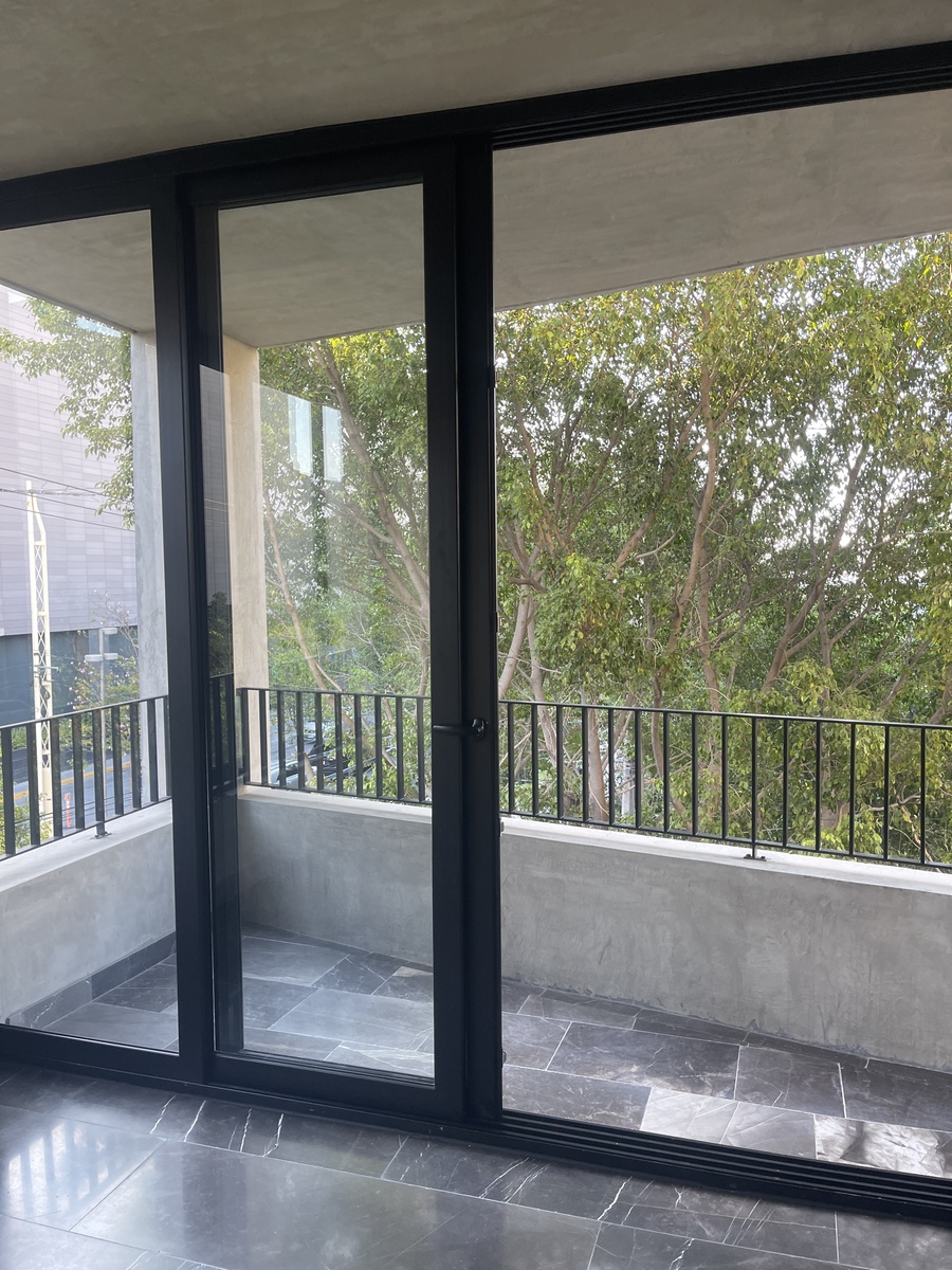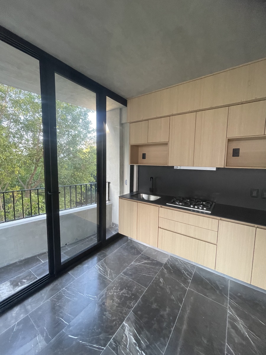 Se encuentra en el nivel 3, cuenta con 2 habitaciones, 2 baños completos, cocina integral, área de lavado, balcón, 2 aires acondicionados y cortinas, espacio para un coche dentro de sótano.