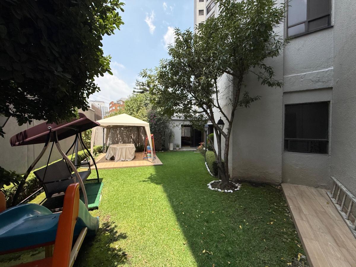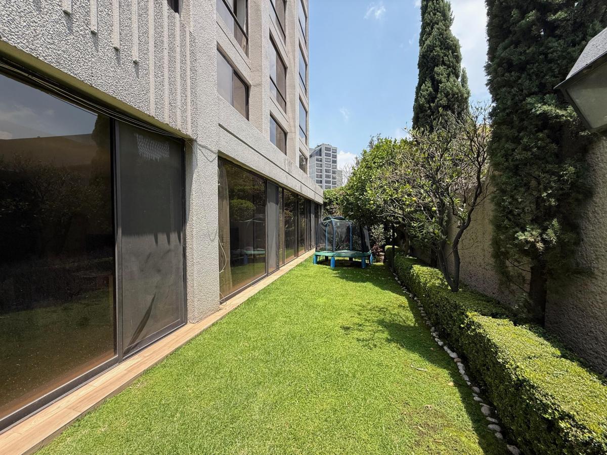 Exclusivo departamento tipo Garden House de 700 m², con 397 m² interiores y un amplio jardín privado de 323 m² que rodea todo el espacio. La sala y el comedor tienen salida directa al jardín, creando un ambiente abierto y acogedor. El family room con antecomedor se conecta a un gran jardín con asador y mesa de tepanyaki, además de contar con salida a otro jardín privado.