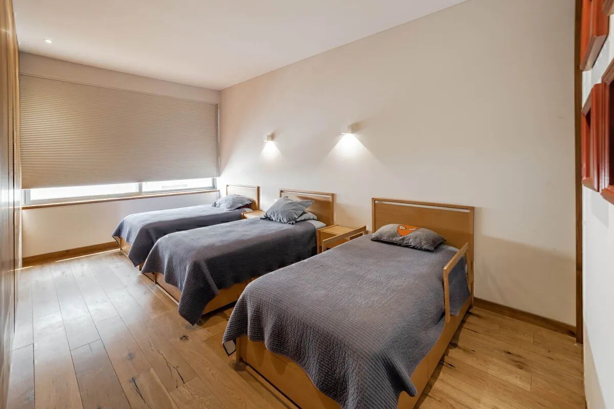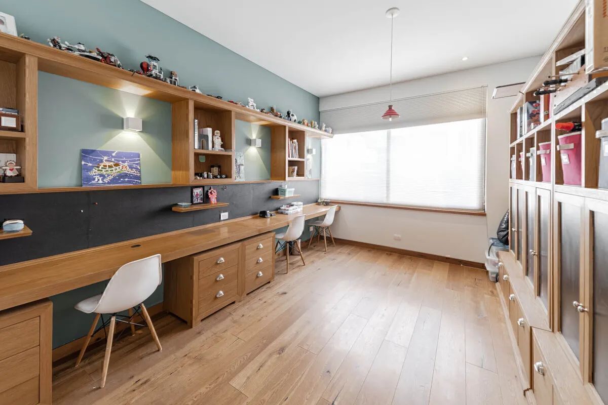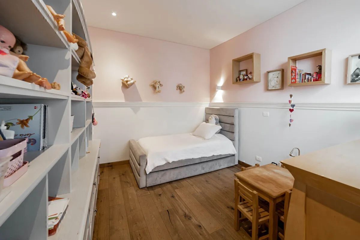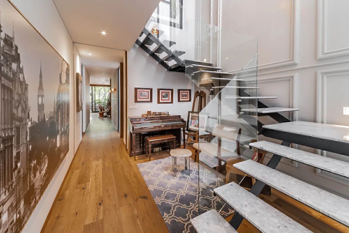 O apartamento possui uma grande sala, que é coberta com piso de madeira importada do chão ao teto, além de ter acesso ao terraço. Cozinha totalmente equipada para guardar qualquer utensílio culinário, banheiro de serviço, sala de família, quatro quartos, cada um com banheiro completo e closet, terraço e jardim no telhado privado.