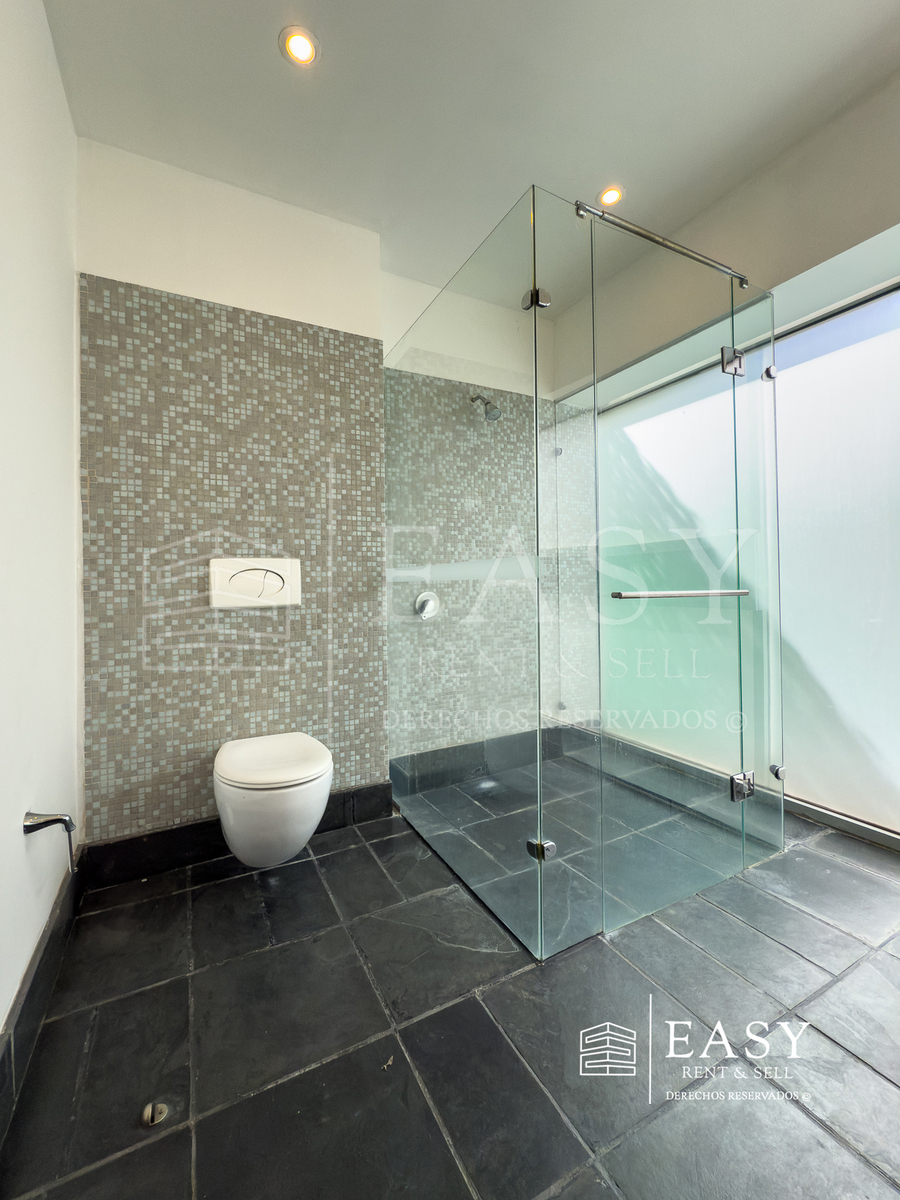 200 m2 conforman la superficie total de éste, distribuyéndose de la siguiente manera: amplia estancia con ventanales de piso a techo, medio baño para visitas, cocina integral equipada con gran capacidad para comestibles e instrumentos culinarios, área de lavado y cuarto de servicio con baño completo. En el área privada hay tres recámaras, cada una con vestidor y baño completo.