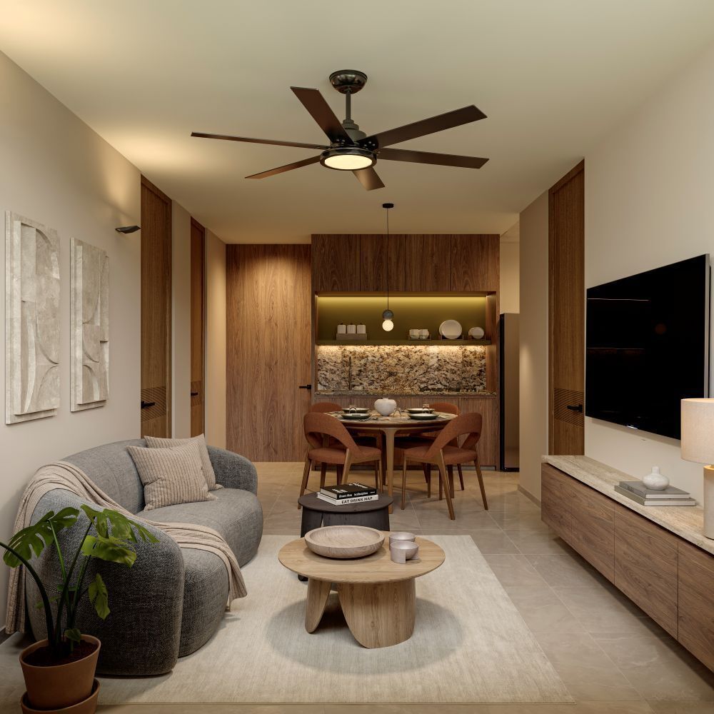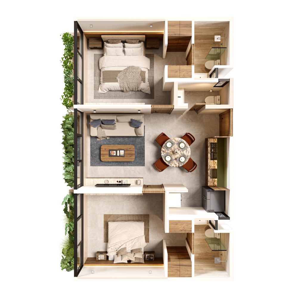 Equipamiento en los departamentos: Parrilla eléctrica, carpintería en cocina y closets.