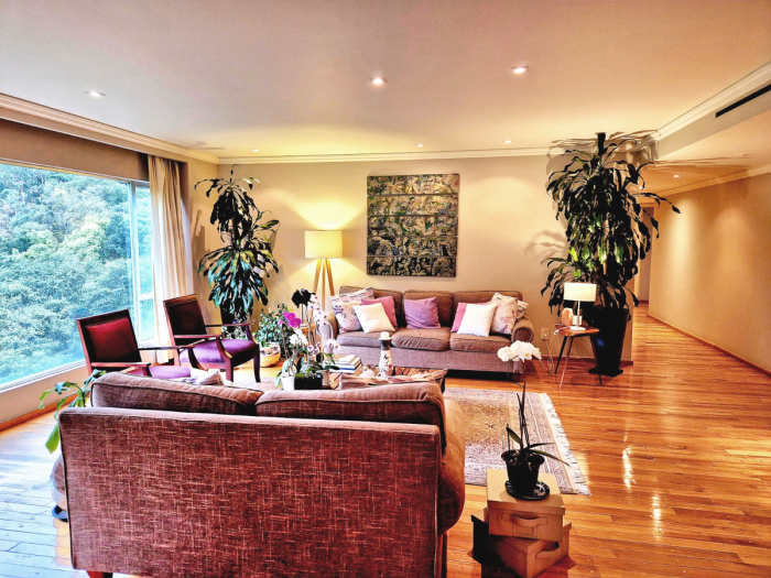 Aqui encontrarás elegancia única, clásica, ubicado medio piso abajo del Lobby, cuenta con recibidor, amplia sala y comedor con vista a la cañada, cocina grande, con desayunador y área para café, 3 amplias recámaras cada una con baño, medio baño de visitas, estudio o family, amplio cuarto de lavado y de servicio con baño. 3 estacionamientos, 2 techados y uno al aire libre.