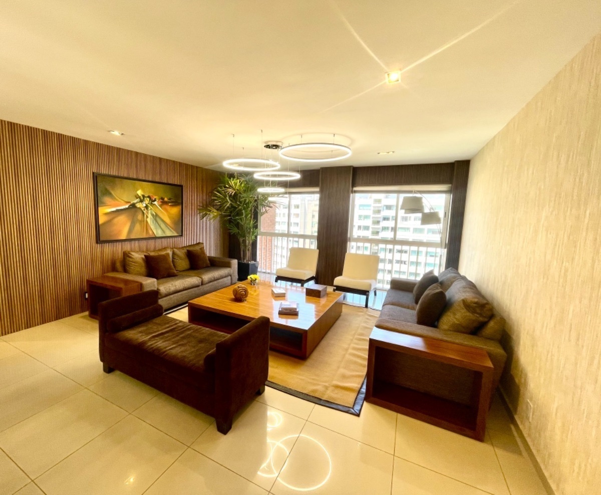 Excelente apartamento para aluguel e venda, recentemente remodelado na área residencial Palma Real. Tem 260m2, sala e comedor de muito bom tamanho, sala de família, área de café da manhã, três quartos muito espaçosos, cada um com banheiro e closet. Cozinha com despensa e armário de armazenamento. Área de lavanderia e quarto de serviço. 3 vagas de estacionamento. Todos os espaços bem iluminados e distribuídos. Áreas comuns muito completas que incluem academia, salão de festas, quadra de paddle, grande jardim com playgrounds e área de churrasqueiras, jardim para pets.