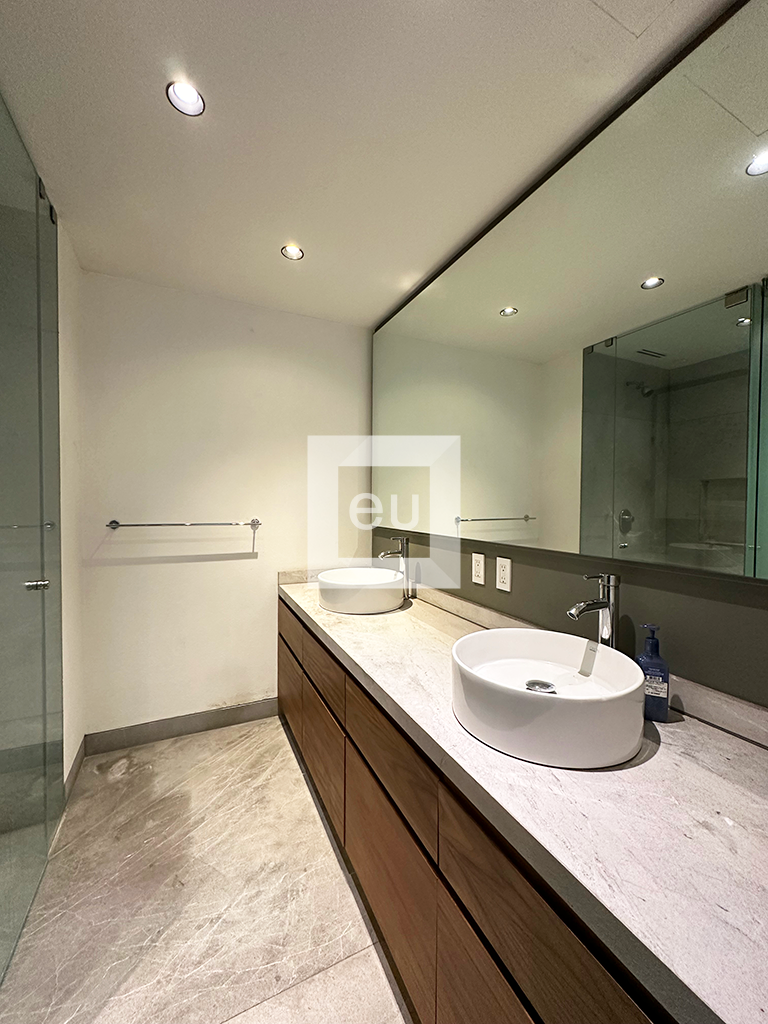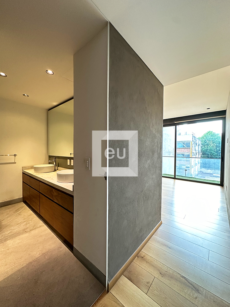 This bright and airy apartment in a fourth-floor architectural project features a single level and features a spacious kitchen with granite countertops, open to the living area, where there is a covered terrace with planters and green views, a guest half bathroom, and a laundry area. The hallway at the back of the apartment leads to a master bedroom with a closet, balcony, and bathroom with double sinks. Next door is a generously sized secondary bedroom that shares a balcony and full bathroom. The building has eight floors, an elevator, and 24-hour security.
