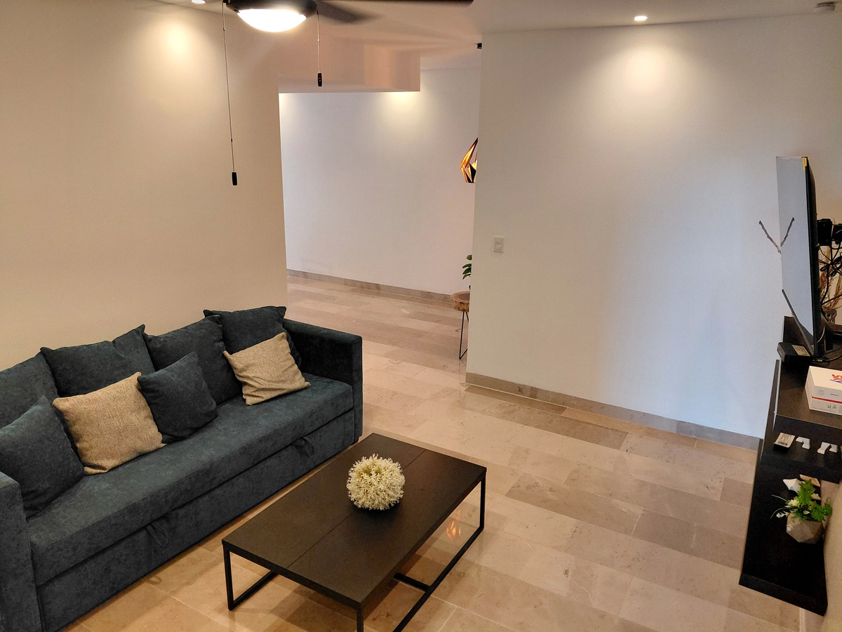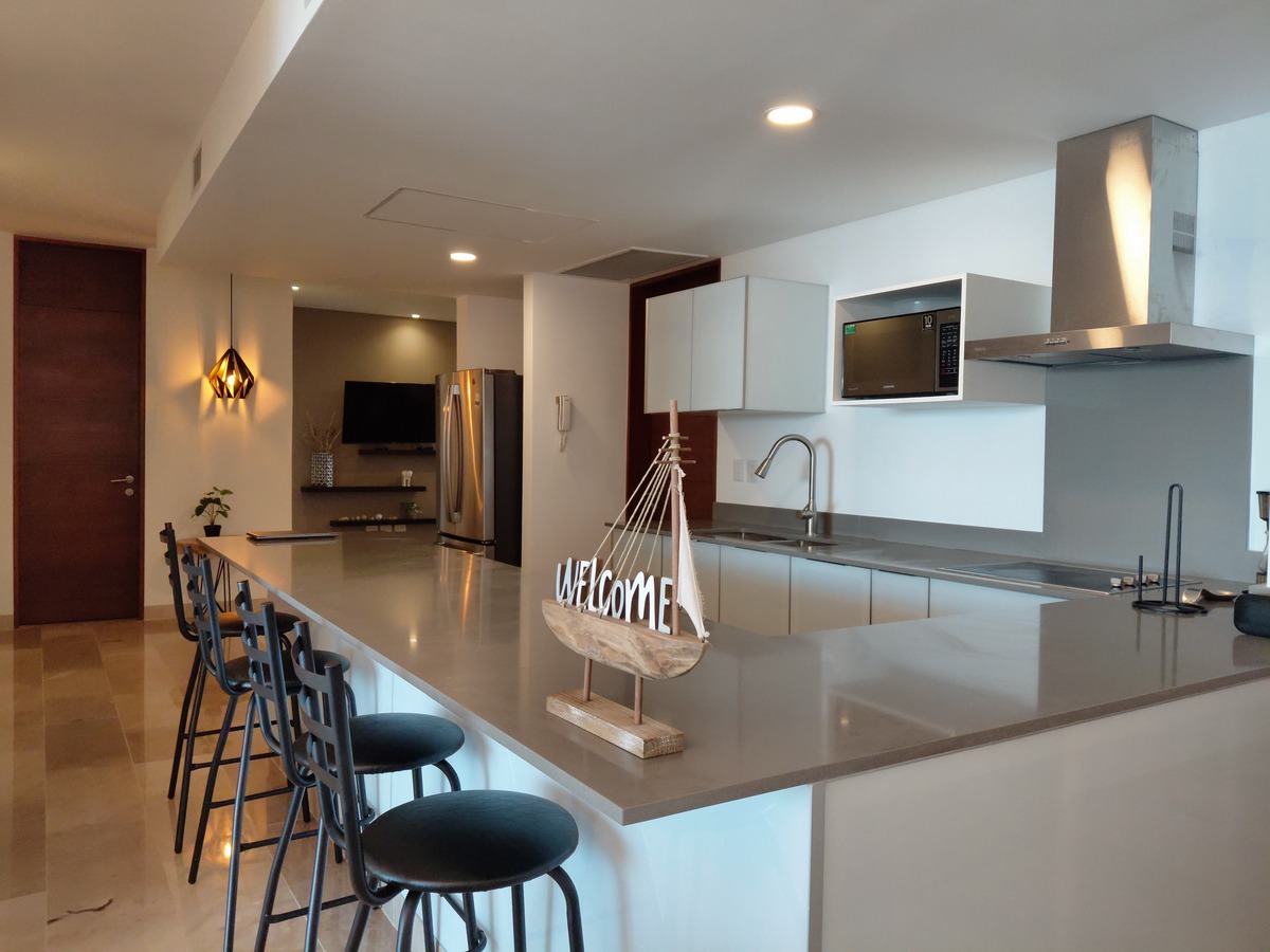 Como mención especial, me gustaría detenerme a platicar de la cocina y área de sala y comedor. Cuentas con una cocina de cuarzo blanco totalmente equipada y amueblada. Además el área de la sala y comedor tienen gran iluminación, natural del mar.