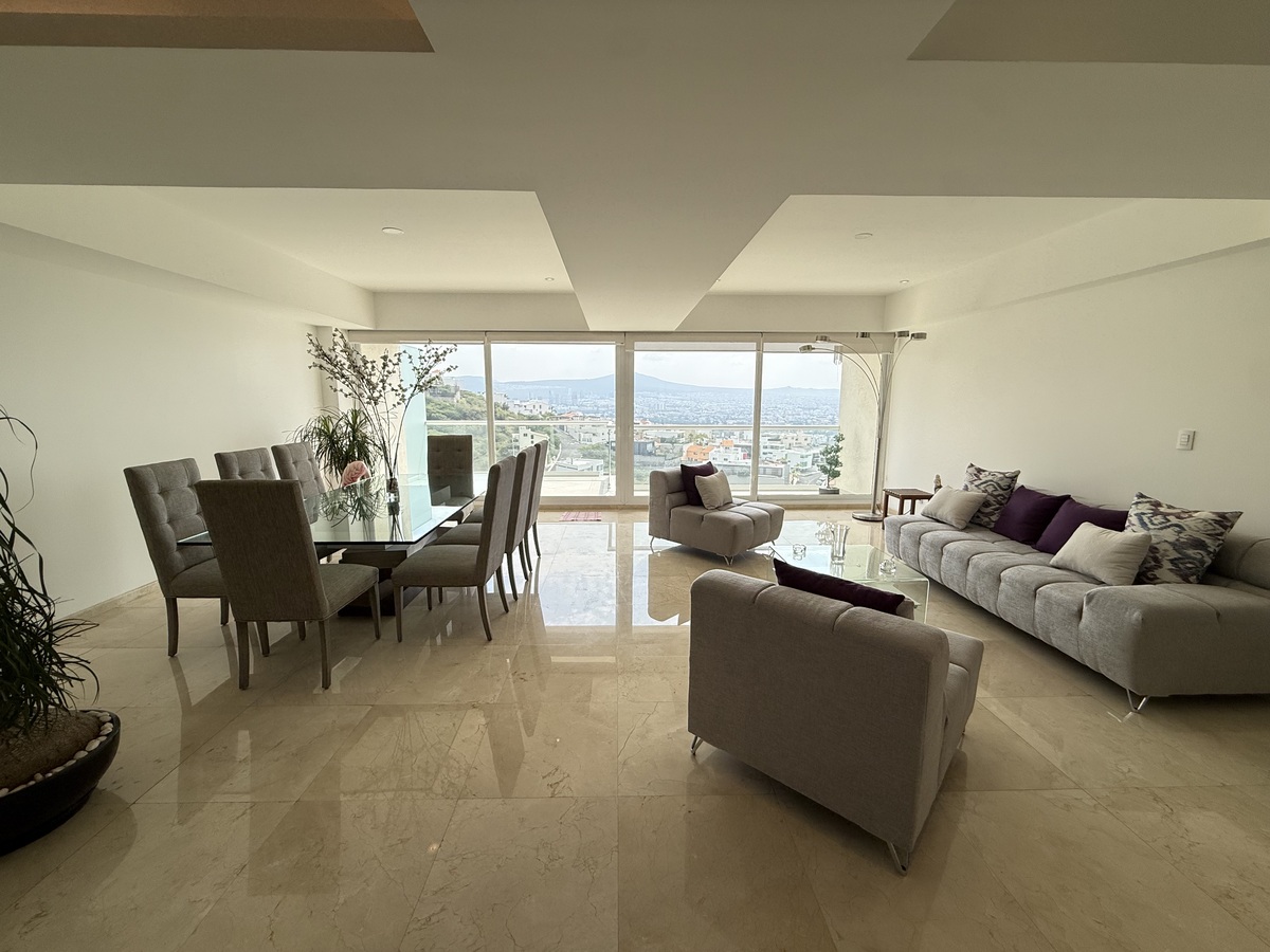 - Estancia muy amplia de sala comedor y cocina, la cocina equipada con parrilla y torre de hornos, en comedor salida a una terraza amplia con vista panorámica a Querétaro zona arcos y centro.