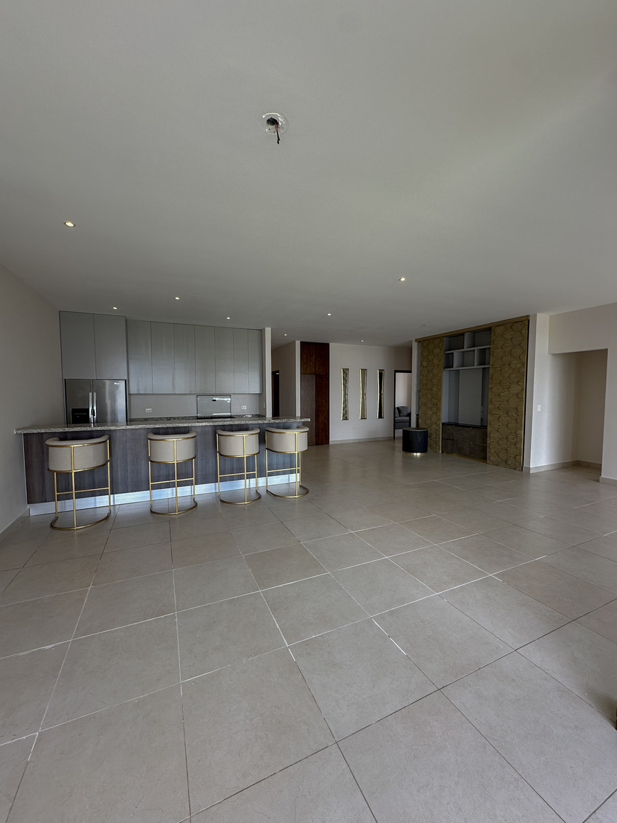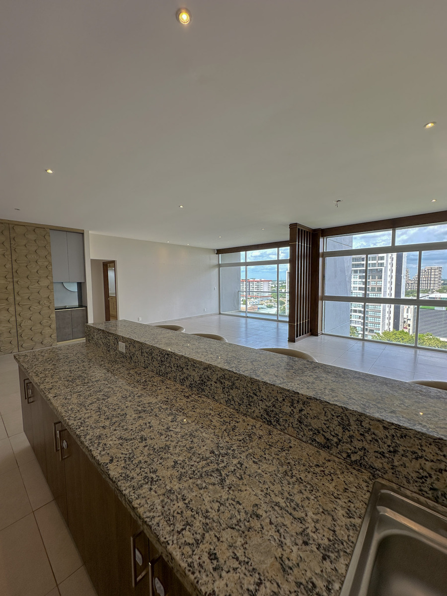 Gran espacio de área social con área abierta y sin columnnas de sala comedor y antecomedor. Terraza techada con vista al parque central.