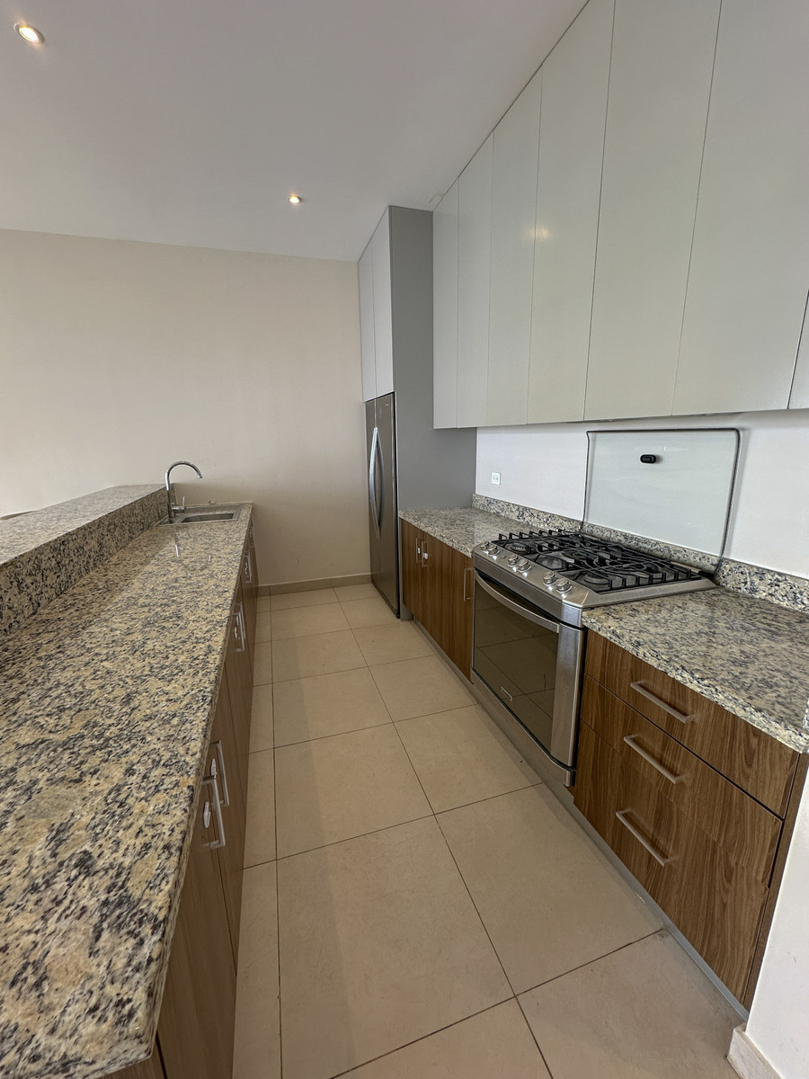 Cocina abierta con barra desayunadora. Cuenta con estufa de gas y refrigerador.