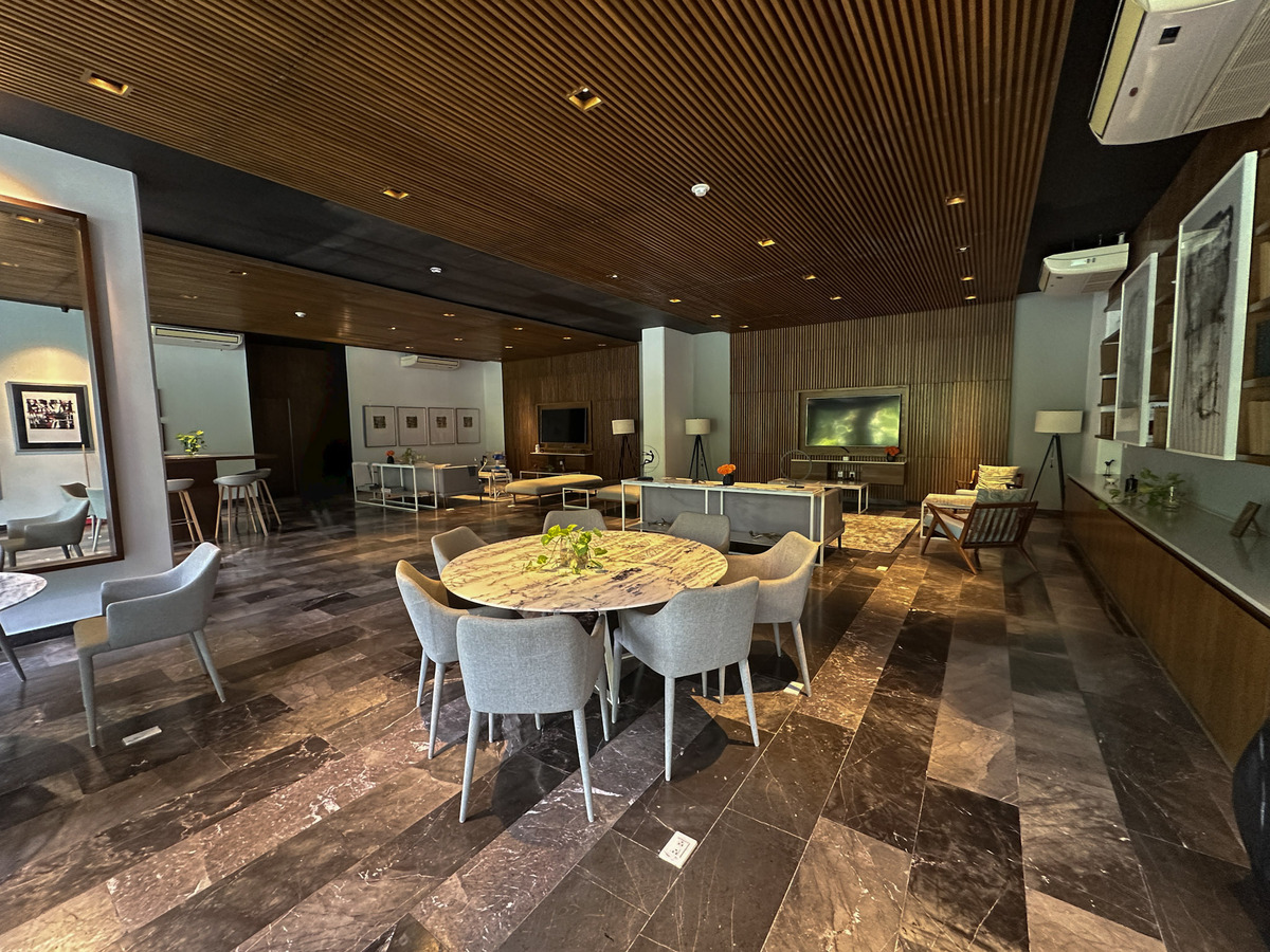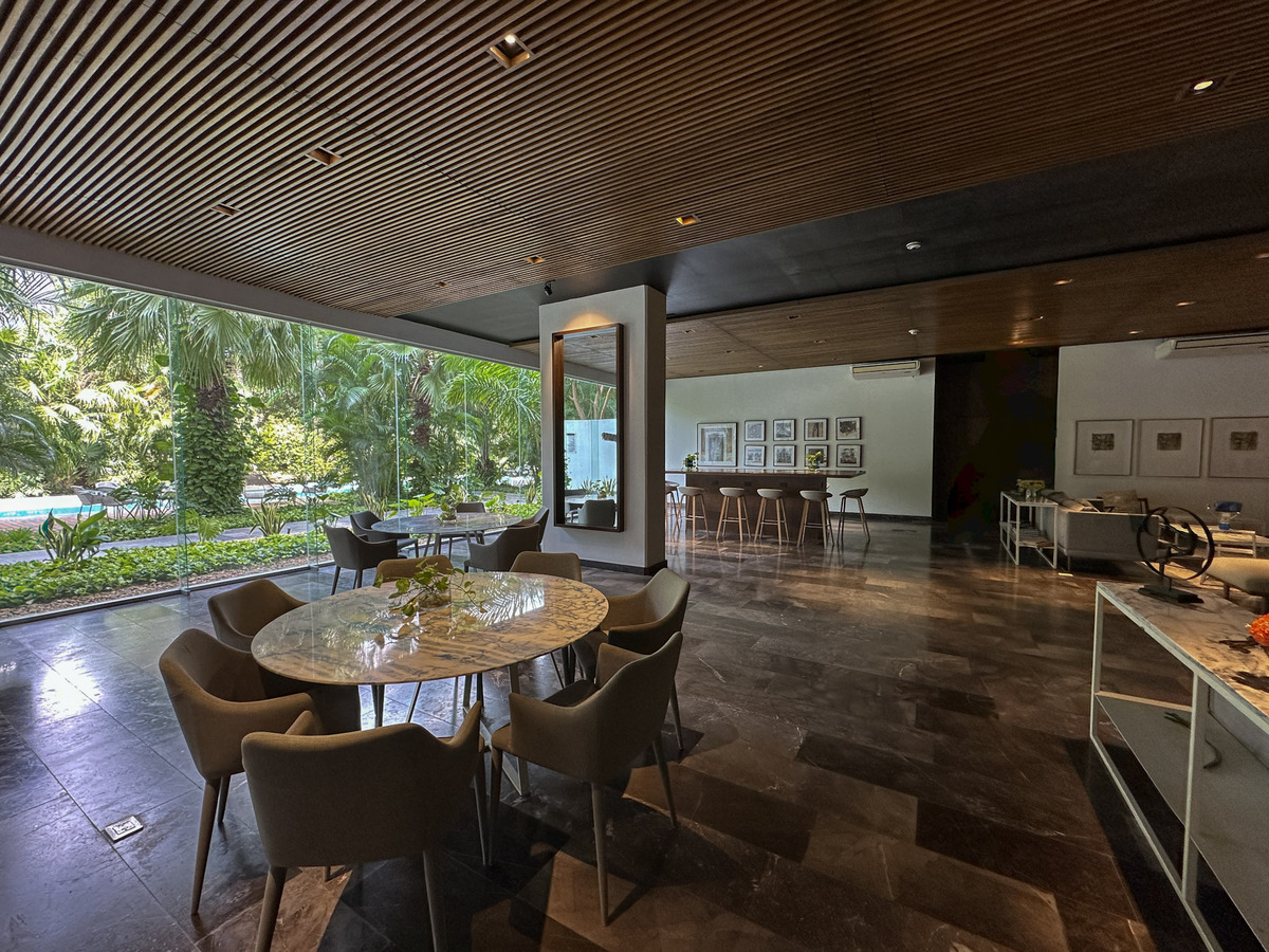 Salon privado con salas, pantallas de TV, mesas para cowork, todo con aire acondicionado y vista al jardín y piscina.