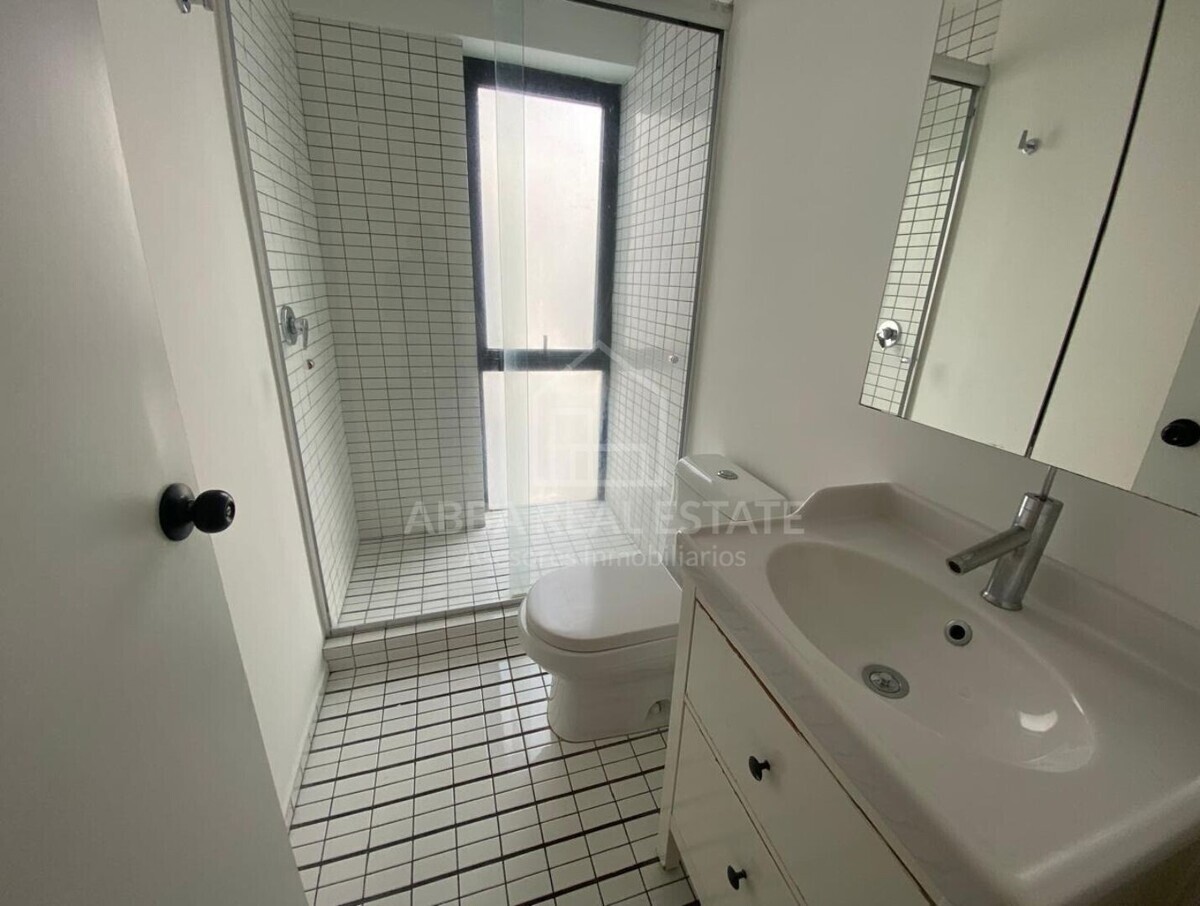 O apartamento conta com uma cozinha aberta moderna que se conecta a uma varanda lateral, ideal para desfrutar de uma vista relaxante enquanto cozinha. A área de lavanderia é prática e bem localizada.