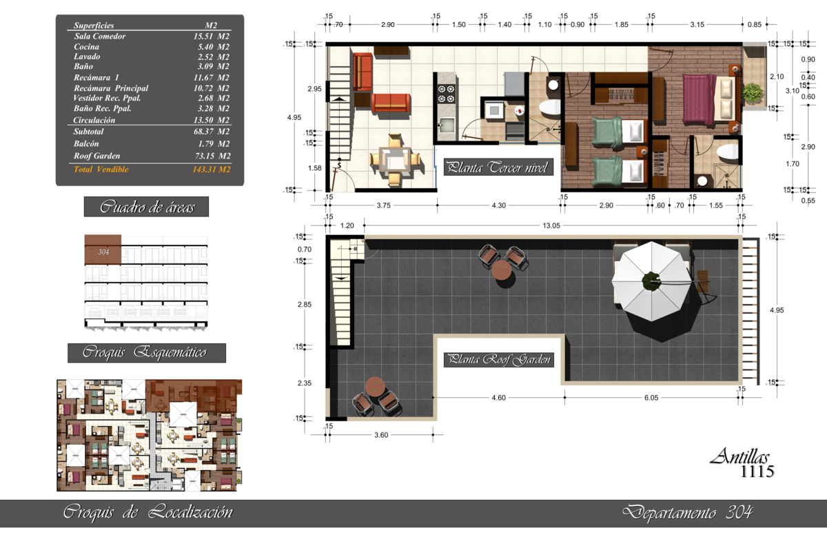 Este departamento, 304, consta de 70.10 m2 y 73.20m2 de roof garden privado.. 2 recámaras, la principal con baño y vestidor, la secundaria con clóset compartiendo baño con área social. Sala/comedor, cocina equipada, área de lavado. 2 lugares de estacionamiento. Acabados de lujo. Ventilación e iluminación natural.