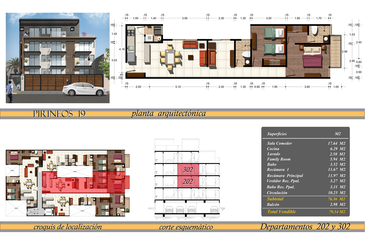 Este departamento, 202, consta de 72 m2 habitables. 2 recámaras, la principal con baño y vestidor, la secundaria con clóset compartiendo baño con área social. Sala/comedor, cocina equipada, área de lavado. 2 lugares de estacionamiento. Acabados de lujo. Ventilación e iluminación natural.