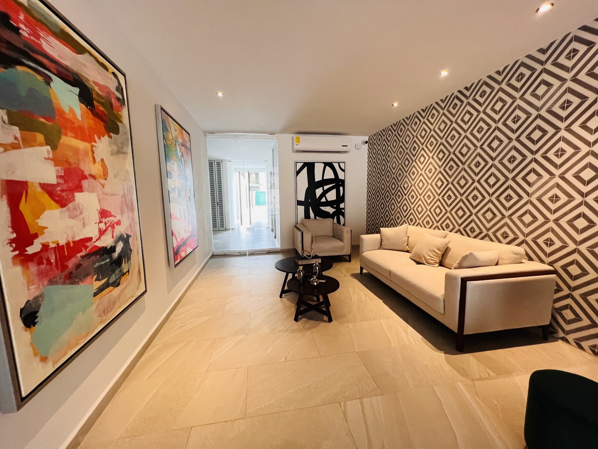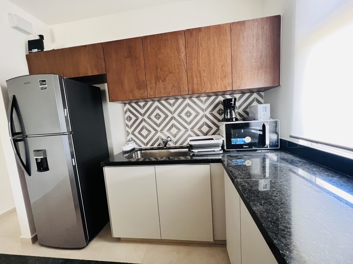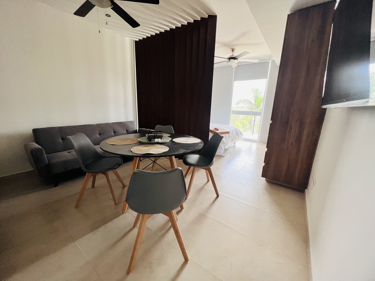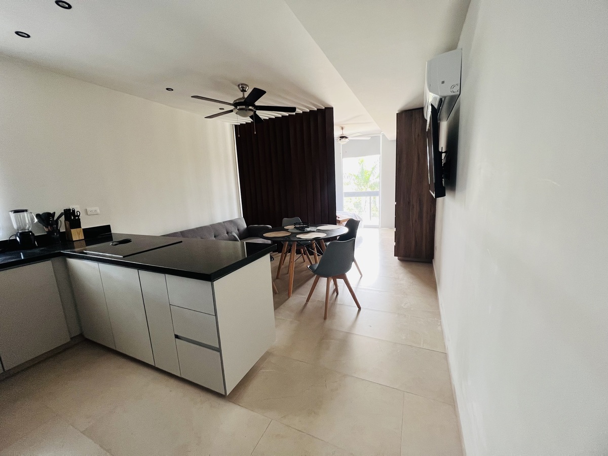 Al ingresar al departamento esta el cuarto de lavado, un baño completo y la cocina con meseta de granito, bar con parrilla eléctrica de 4 quemadores, refrigerador y horno de microondas. En el área de la sala hay un sofá y un comedor redondo para 4 comensales, está área esta separada de la recámara con un muro de madera calado, que da mucha vista. En la recámara cabe una cama tamaño queen, además tiene un closet de buen tamaño y un gran ventanal con vista a un área verde.