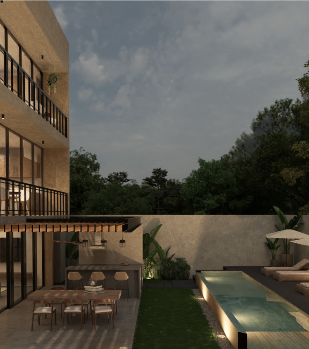 El desarrollo consta de caseta de seguridad, elevador, estacionamiento de visitas techado, estacionamiento privado techado, alberca, baño común, asoleadero, jardines, terraza cubierta, parilla y asador, salón para eventos cerrado y climatizado, roof garden y/o co-worwing.