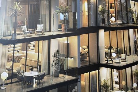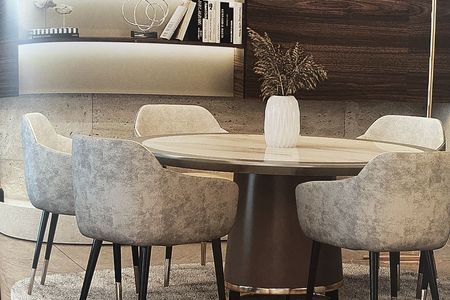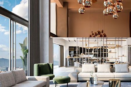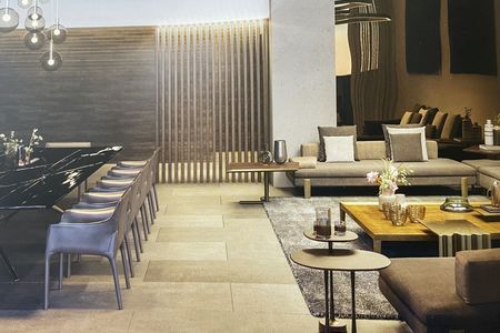 Em um único nível de 328 m2 de área útil com acabamentos em madeira, mármore e pedra.