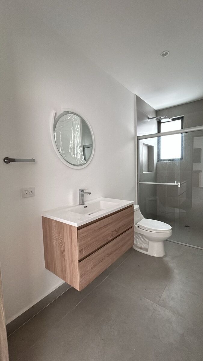 Banheiro completo que é compartilhado pelos quartos secundários e pela área social