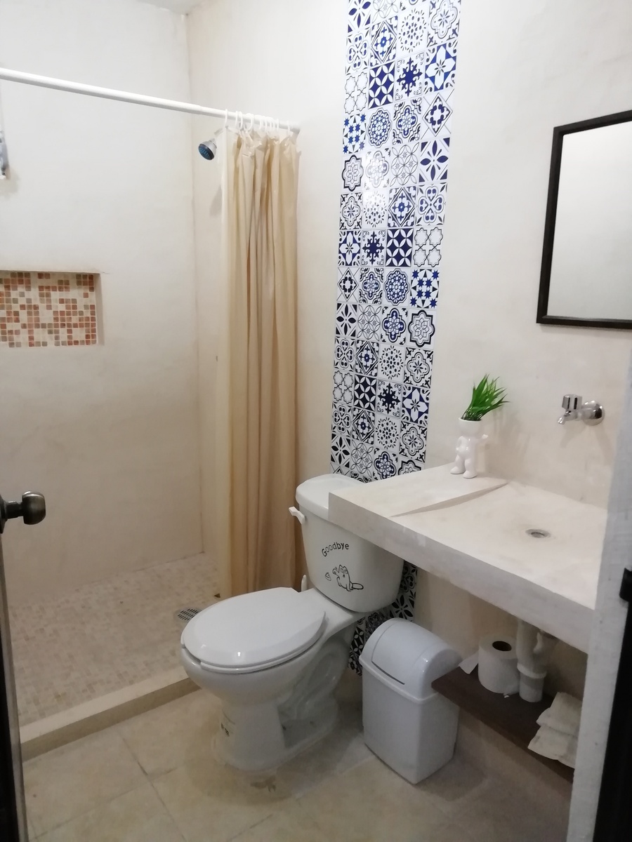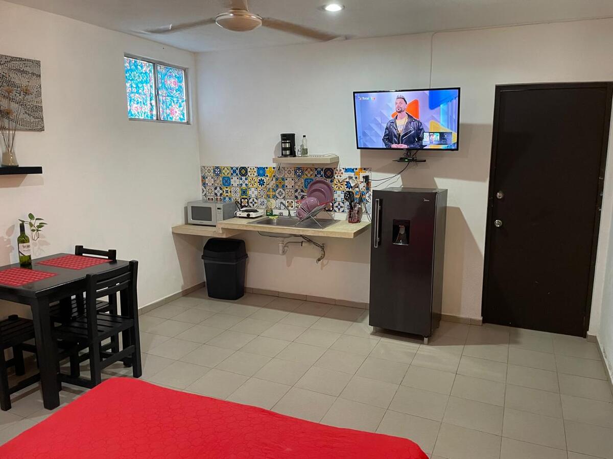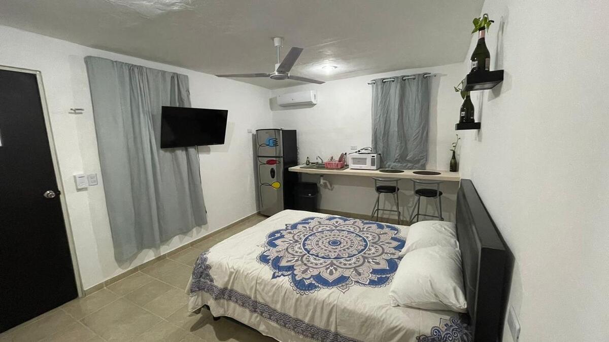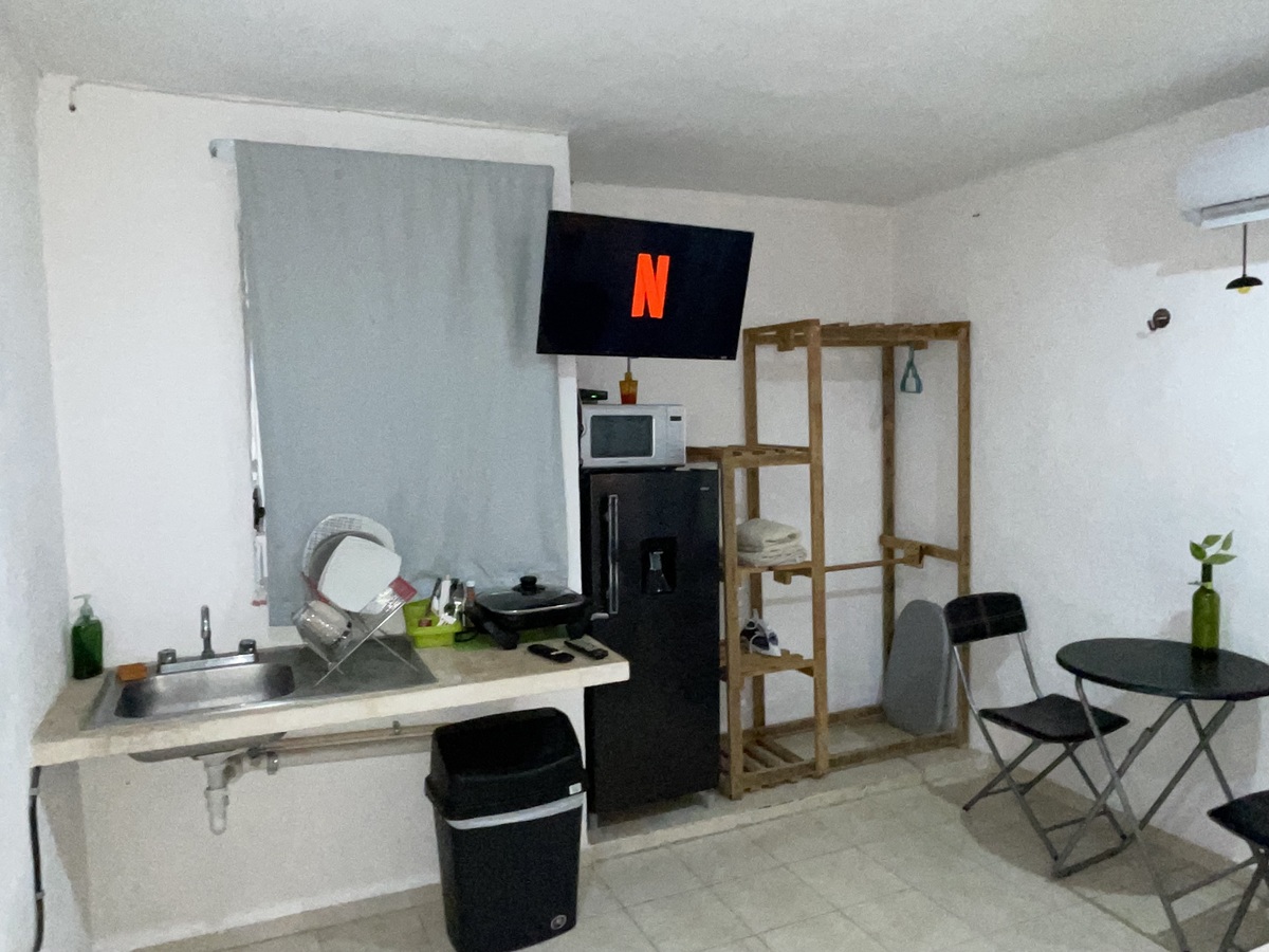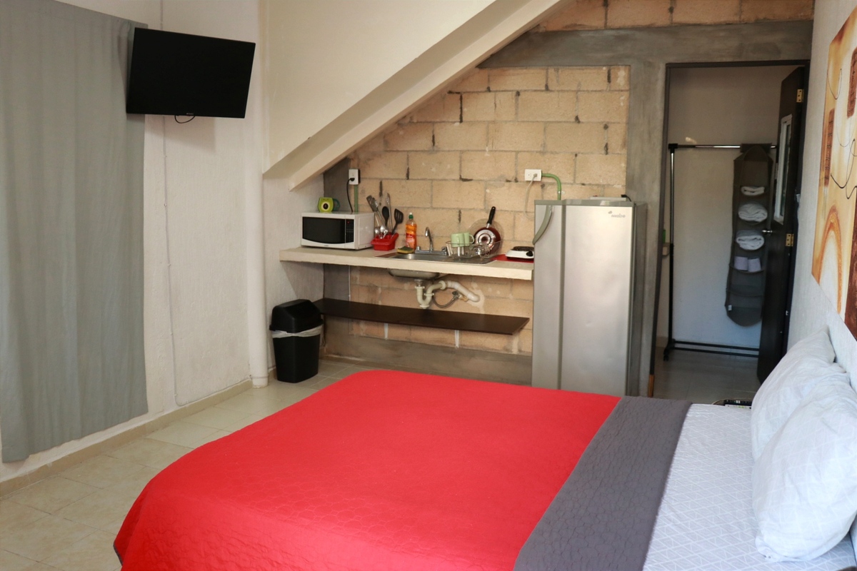 - todos los departamentos cuentan de manera individual con AA, pantalla, baño completo, cocineta equipada, refrigerador, micro, meseta y dos sillas, cama matrimonial y todo lo necesario para una estancia tranquila y agradable.
