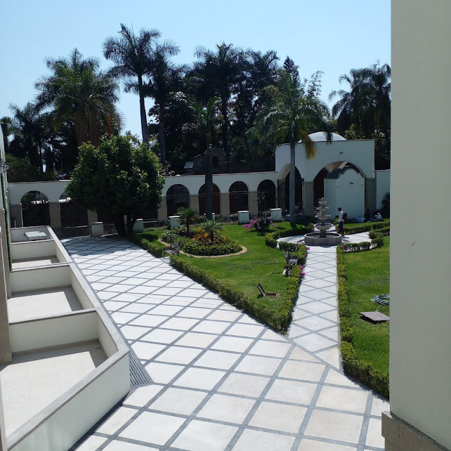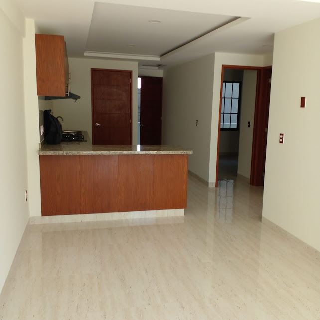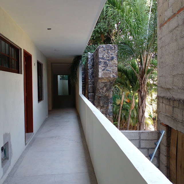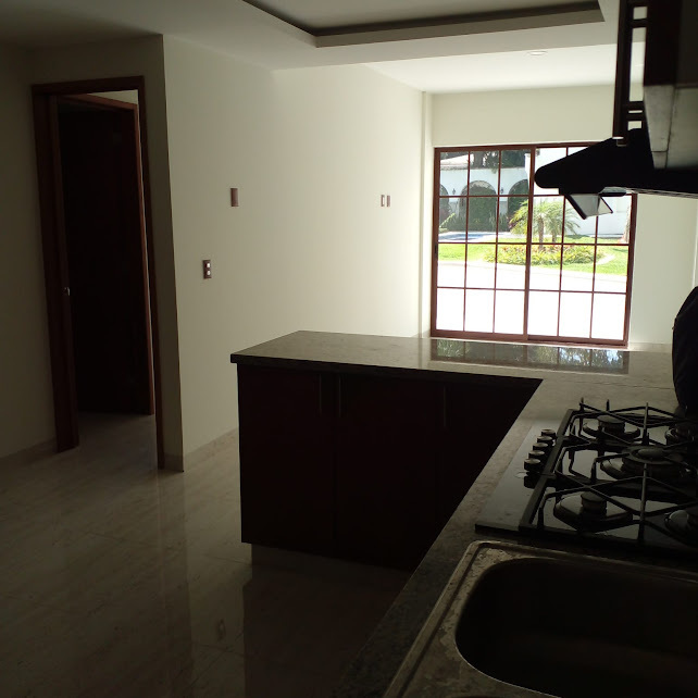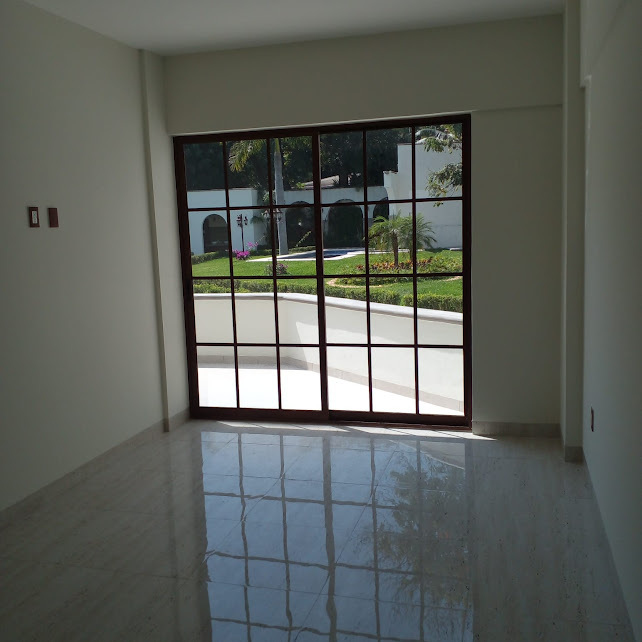 Sala / Comedor, con balcón y vista a amplios jardines y amplia alberca.