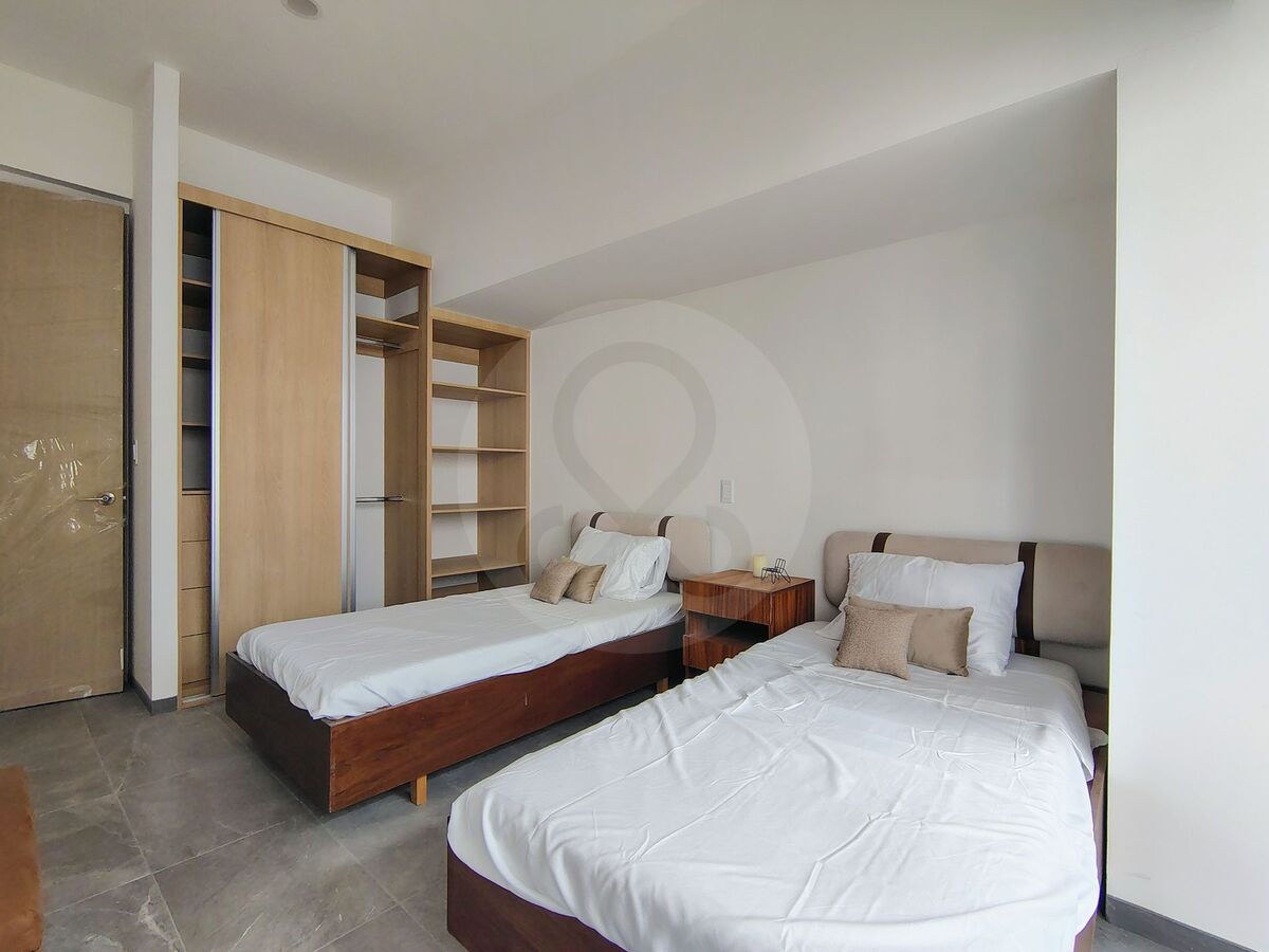 - 2 habitaciones con espacio para cama king size o dos camas individuales, la recámara principal con baño y vestidor, la secundaria con closet y baño compartido con área social.