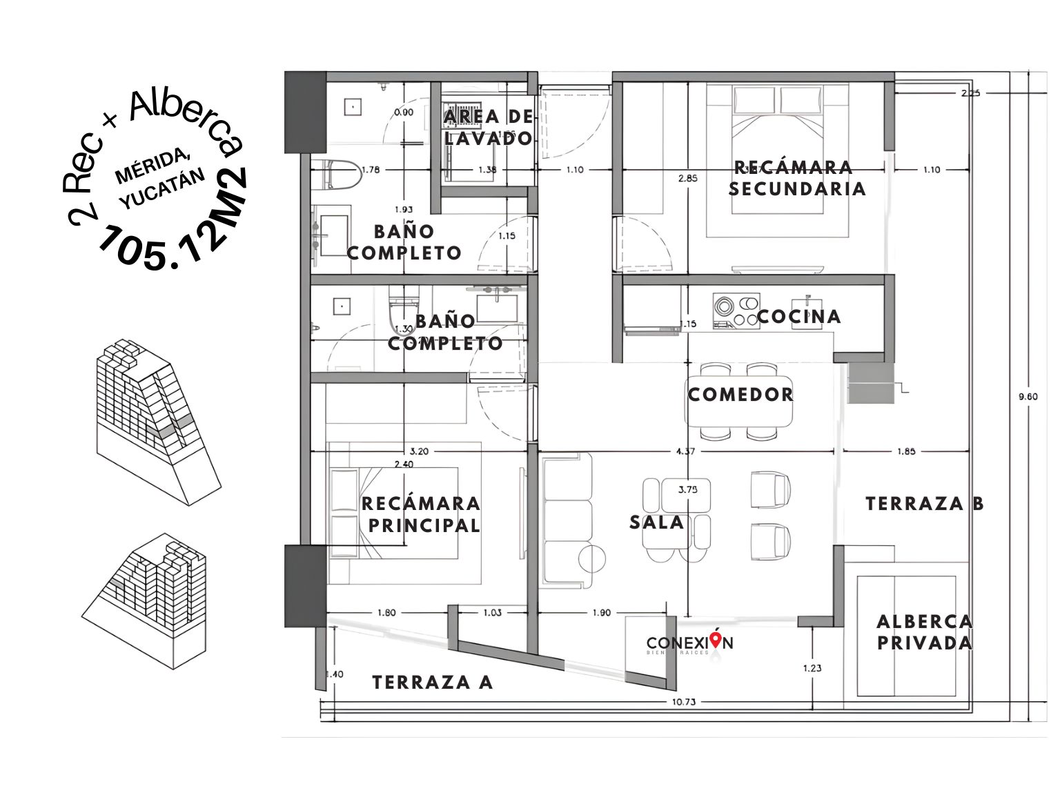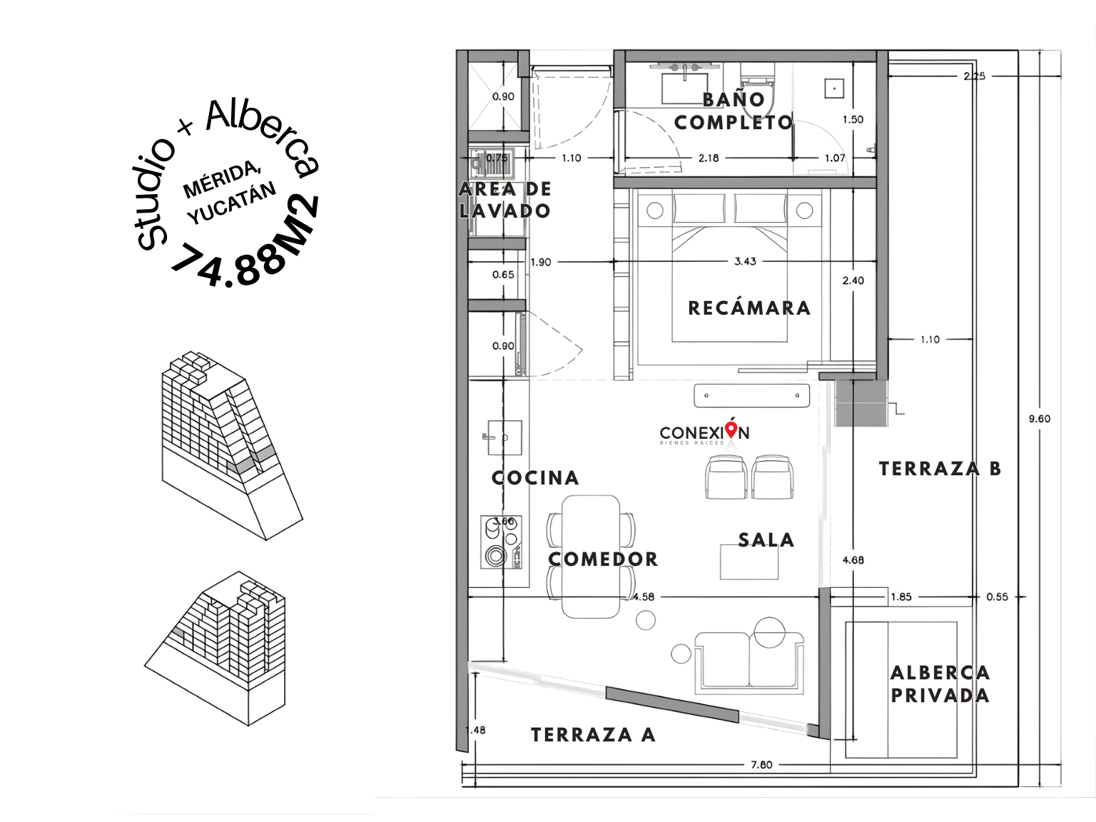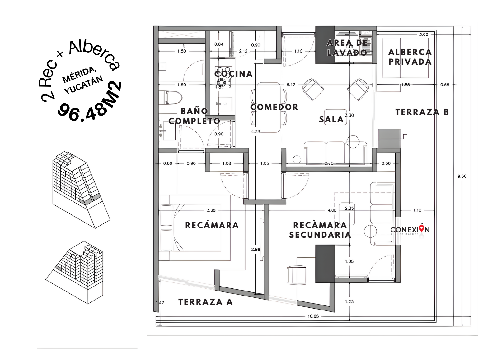 🔹Penthouses con Rooftop y Alberca privada: (2 modelos de 7103.68m2 y 108.48m2). Su diseño es en dos niveles, y te ofrece en planta baja: 1 Recámara tipo Loft, 1 baño completo, estancia, cocina y cuarto de lavado. En planta alta: un Rooftop con summer kitchen, terraza y alberca privada.