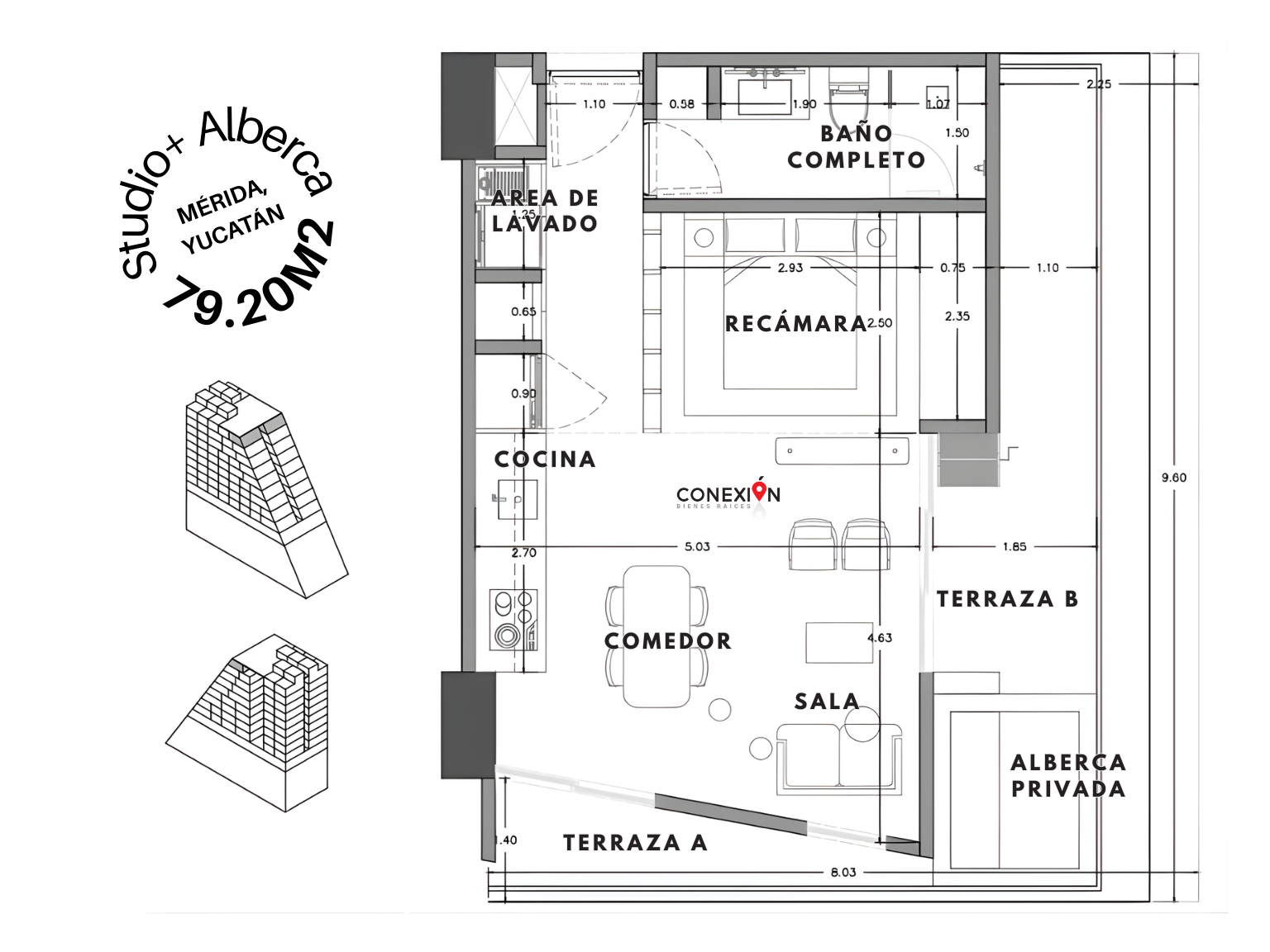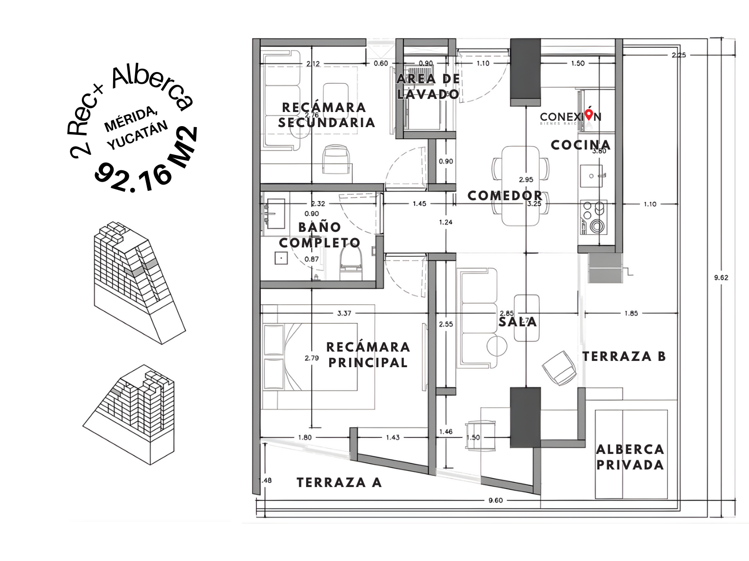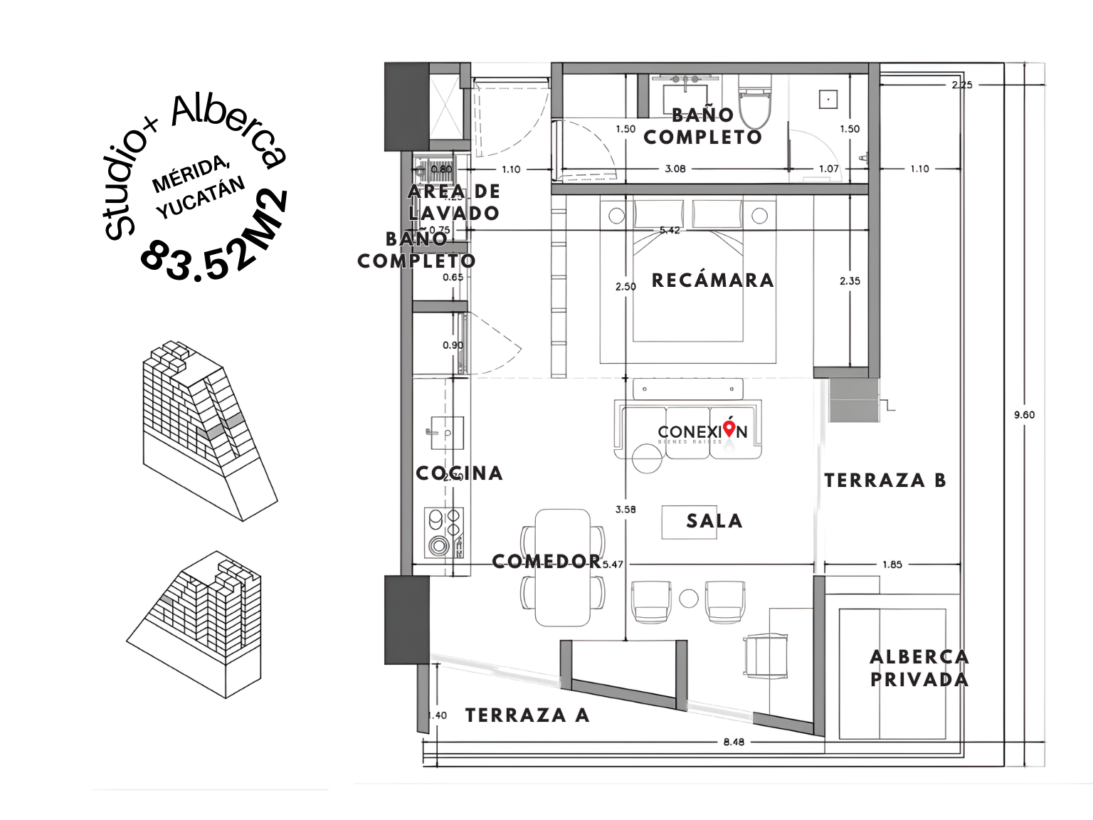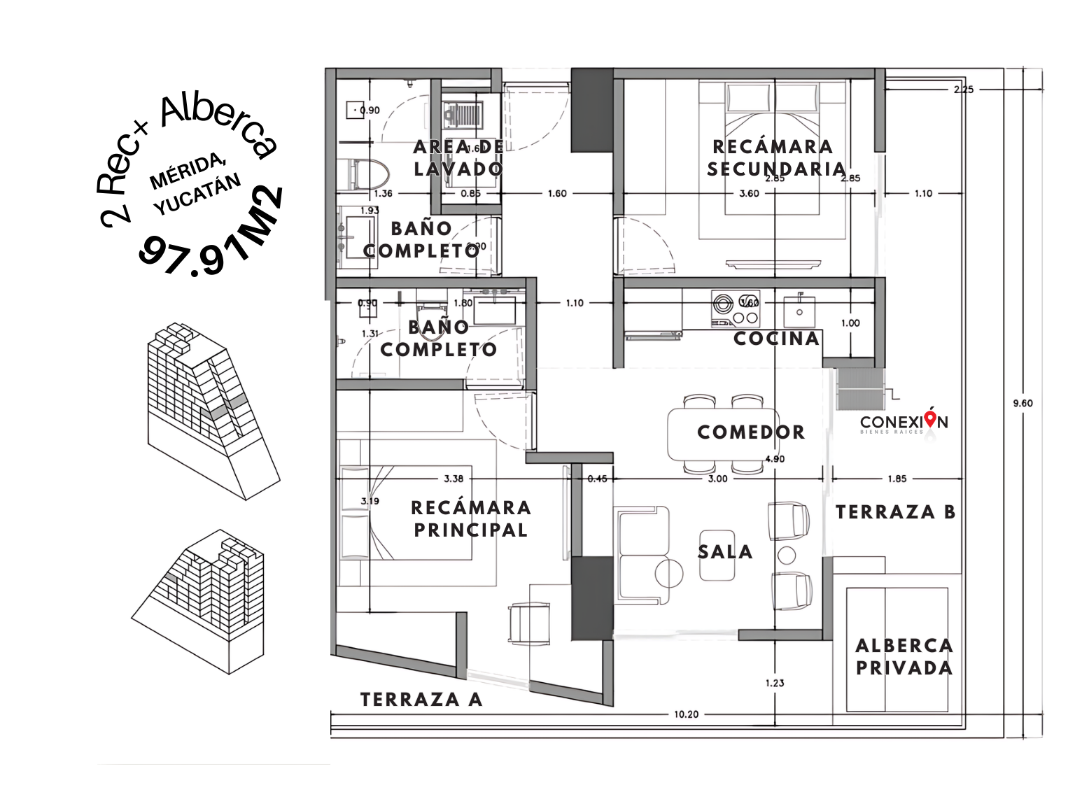 🔹Penthouses con Rooftop y Alberca privada: (2 modelos de 7103.68m2 y 108.48m2). Su diseño es en dos niveles, y te ofrece en planta baja: 1 Recámara tipo Loft, 1 baño completo, estancia, cocina y cuarto de lavado. En planta alta: un Rooftop con summer kitchen, terraza y alberca privada.