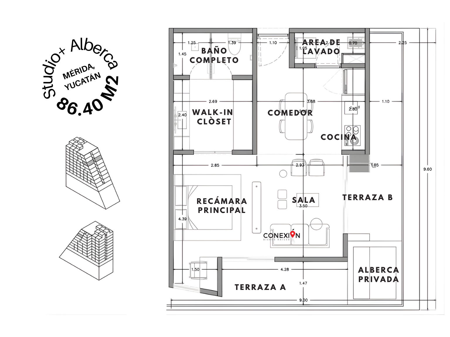 MODELO A con superficie de 86.40m2: Sala, Comedor, Cocina, Área de lavado, Recámara principal con espacio para walking clóset y Baño completo. Recámara Secundaria. Un segundo baño completo. Terraza.