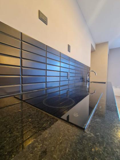 -Cocina con meseta de concreto recubierta de granito negro marca mido modelo verde ubatuba y carpintería de madera de caobilla color nogal.