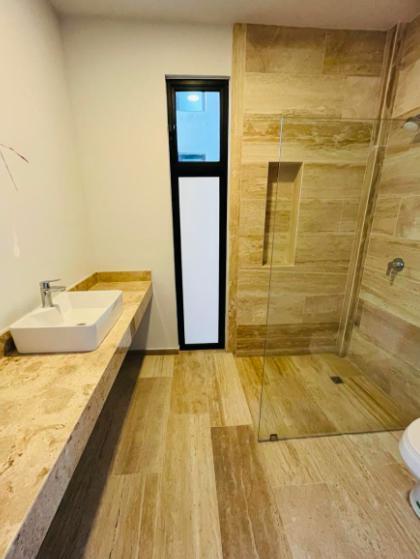 -Mesetas de baño de concreto con recubrimiento de mármol travertino Veracruz acabado pulido.