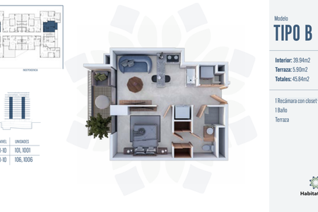 2 recámaras, 1 baño completo y 1 cajón de estacionamiento con opción de bodega. Terraza con alberca, terraza para eventos, elevadores y más.