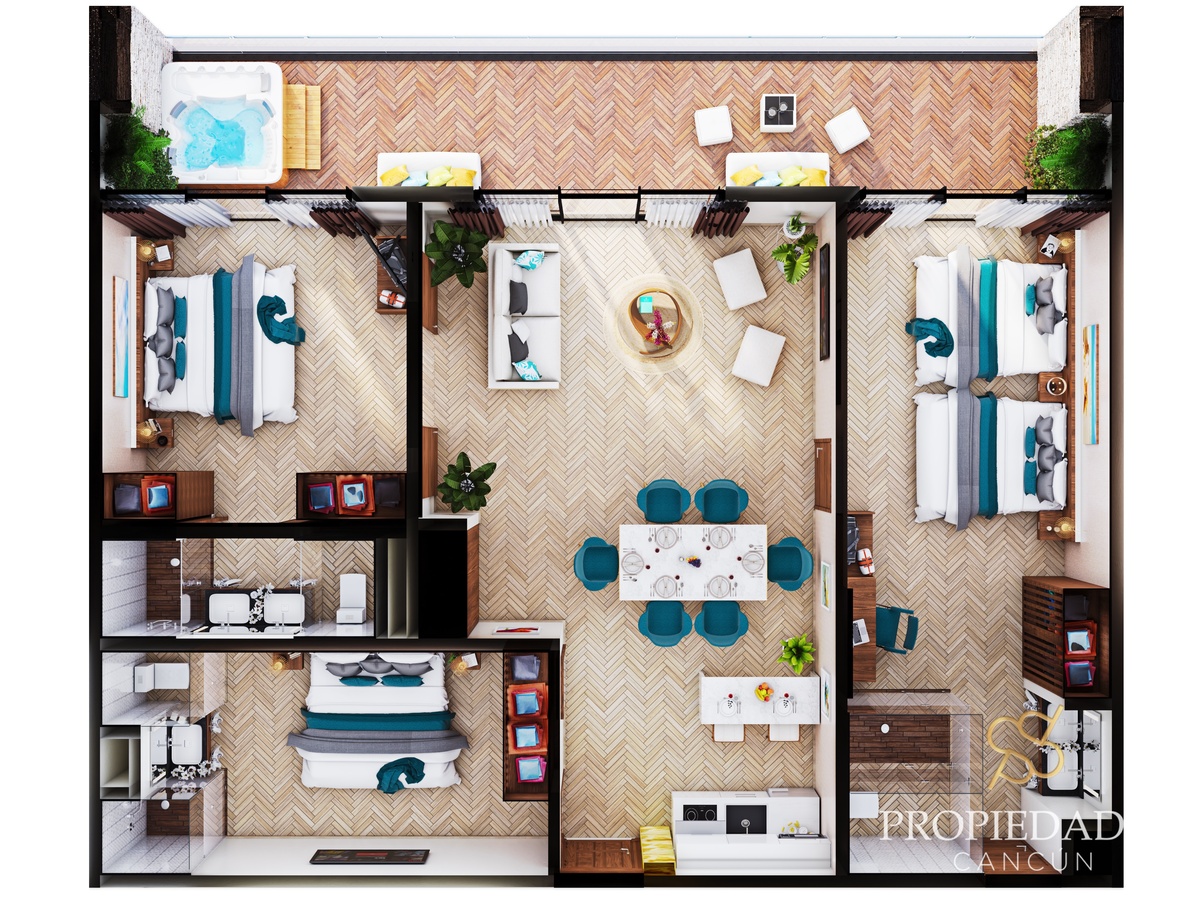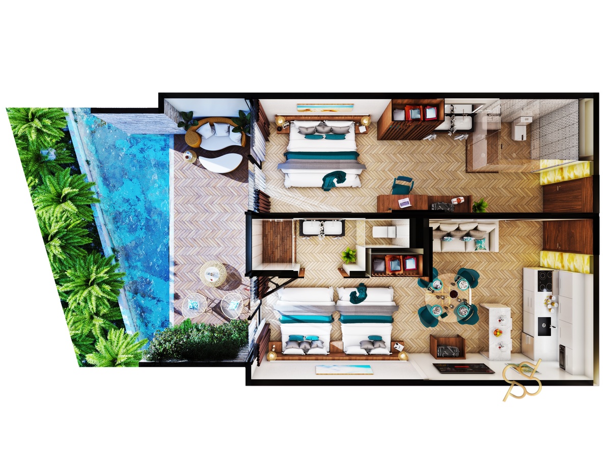 Wyndham Grand Mayakaan Residences Riviera Maya se compone de seis torres residenciales, con dos de ellas dedicadas a las más exclusivas amenidades. Ofrecemos tipologías que van desde cómodos apartamentos de 1 habitación con 46.91 m² de construcción, hasta amplias residencias de 3 habitaciones con 142.79 m² de construcción, todas diseñadas con interiores y terrazas que te permitirán disfrutar de vistas espectaculares y una vida de confort.