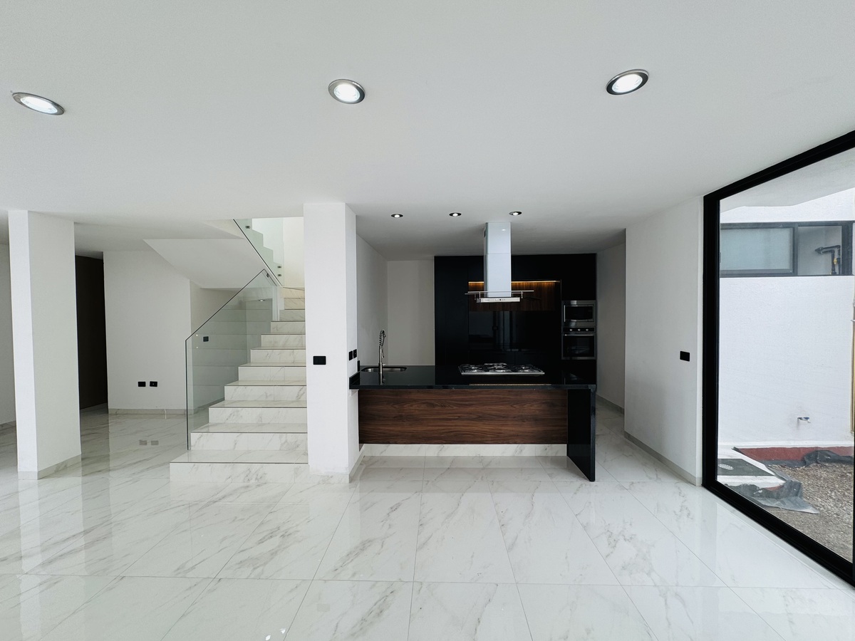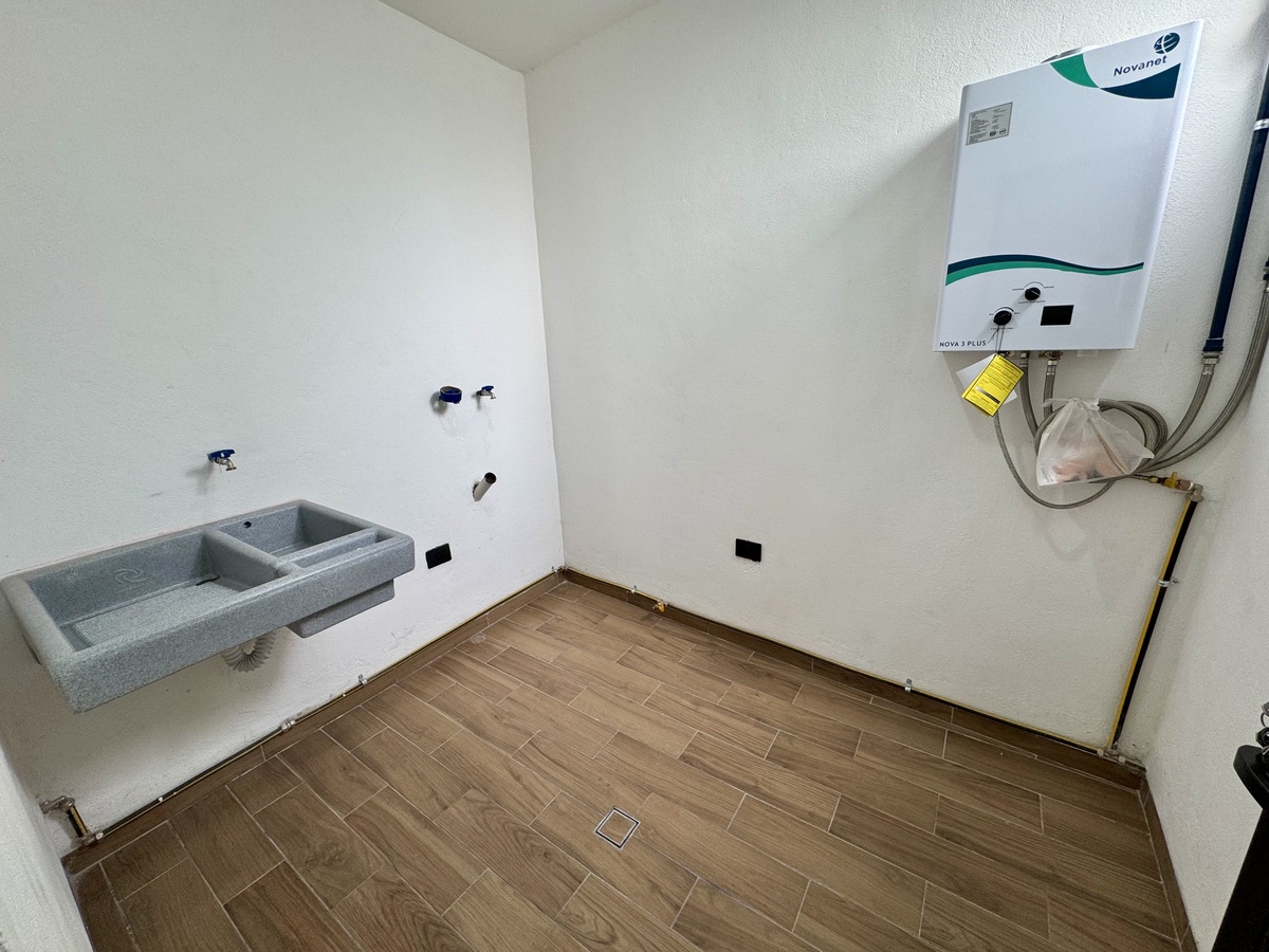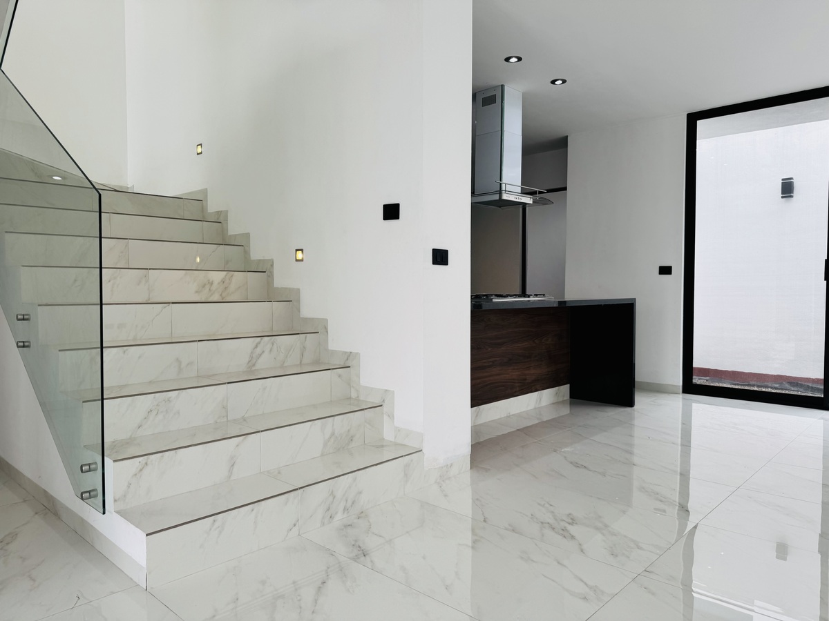 Planta baja: 1/2 baño, sala, comedor, cocina equipada, cuarto de lavado, pequeño jardín, cisterna 2,800 lts. y tinaco de 1,100 lts