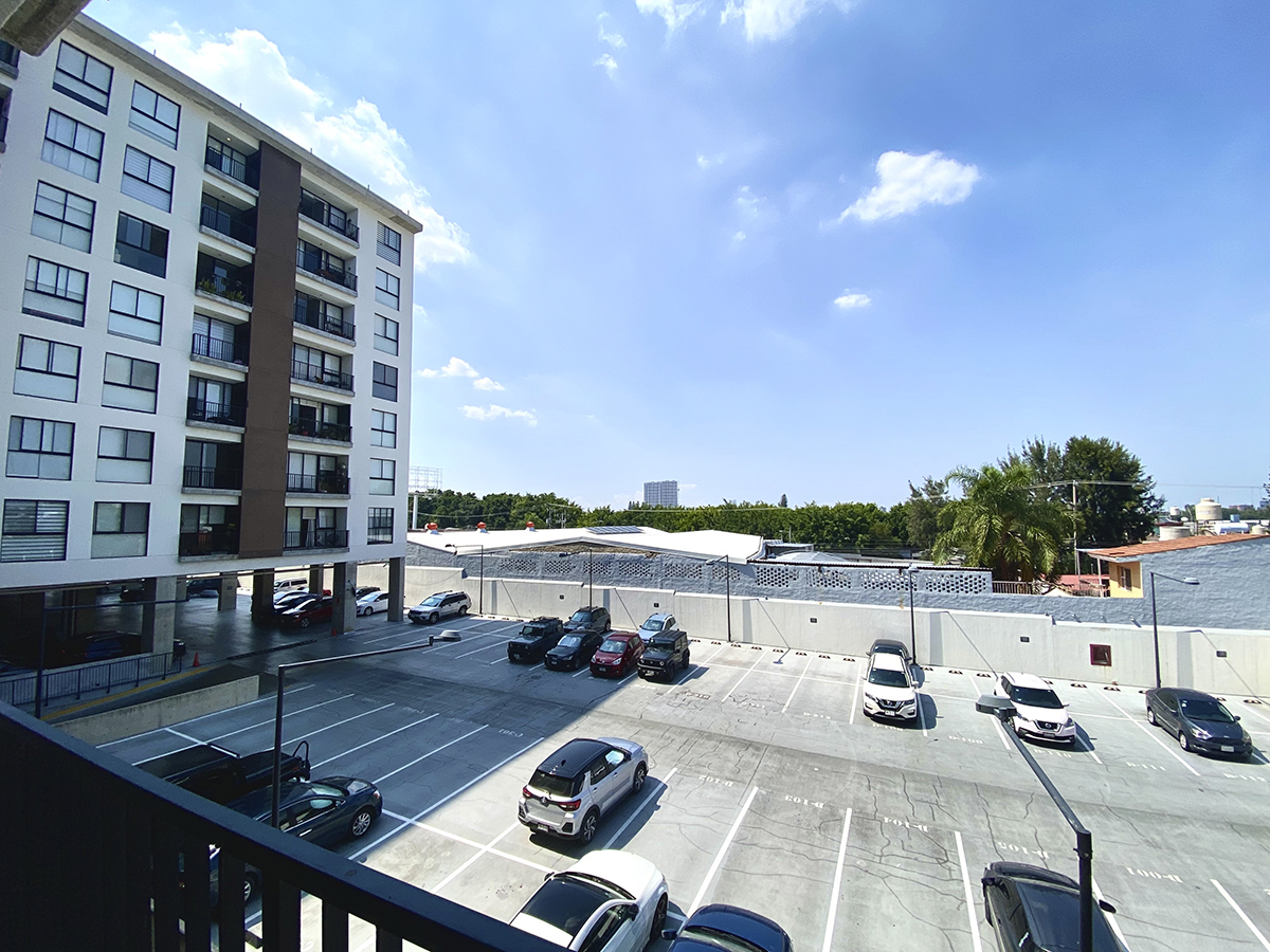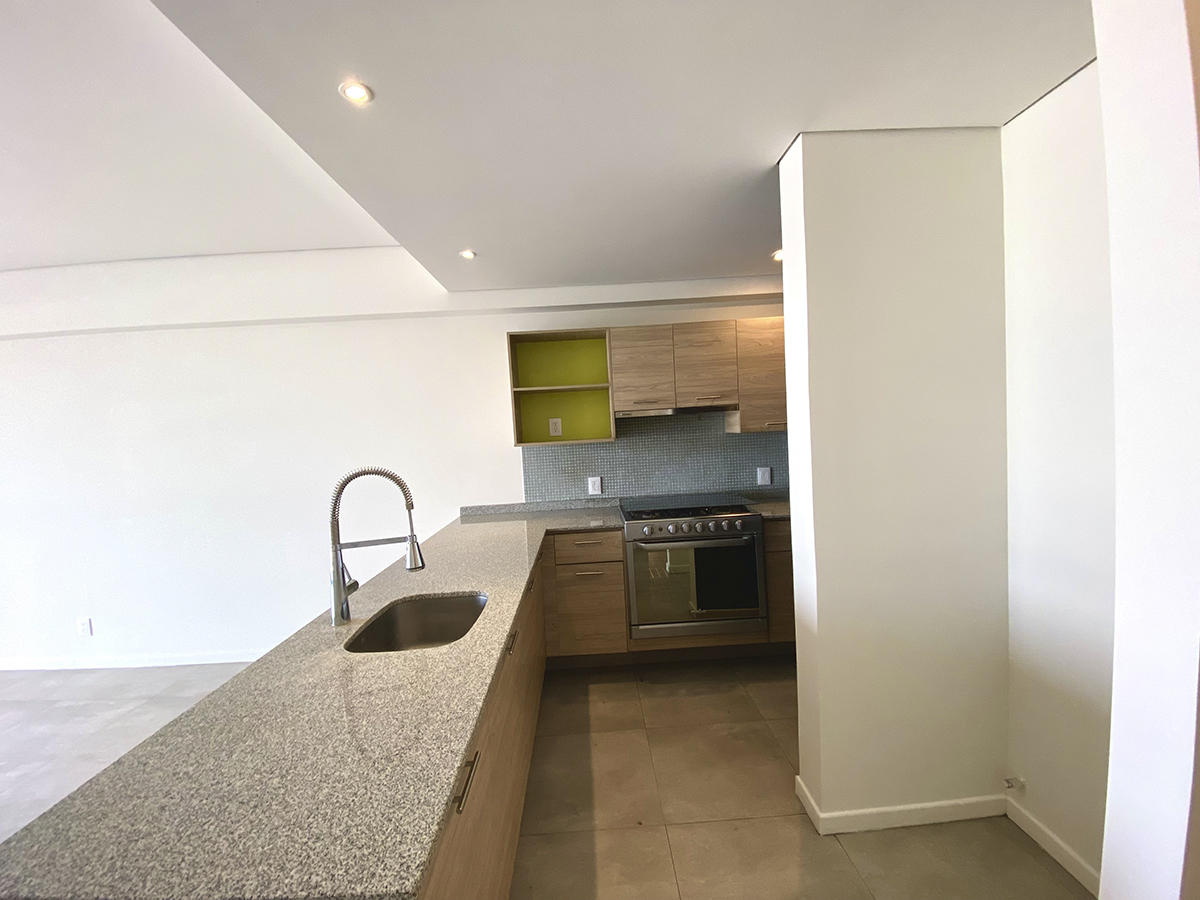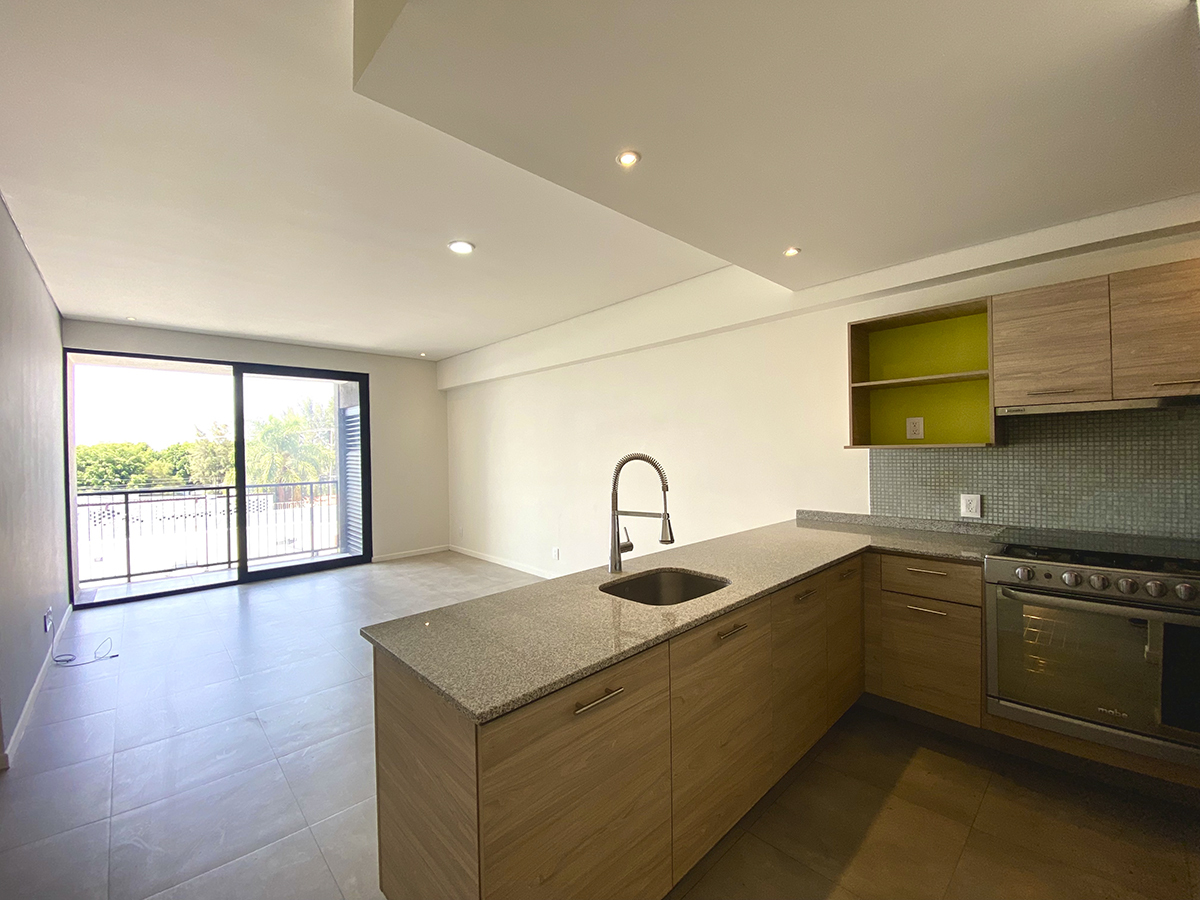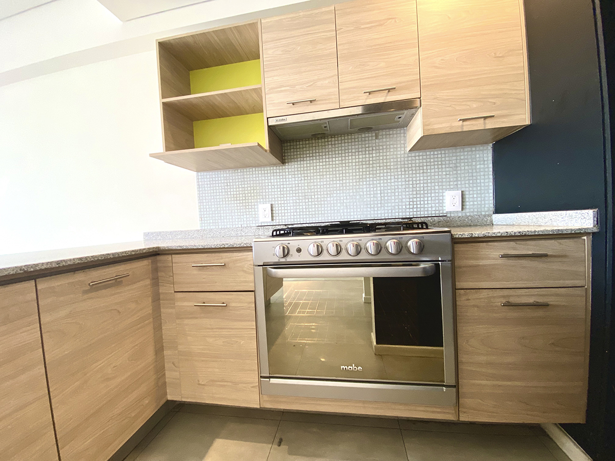Departamento en condominio “Maestro Life”, primer piso, dos recámaras con clóset, dos baños completos, área de sala comedor, balcón, cocina integral con cubierta de granito y estufa, horno de gas y campana, área de lavado y estacionamiento para dos autos. Alberca, asadores, social room, cuarto de táreas y gimnasio.