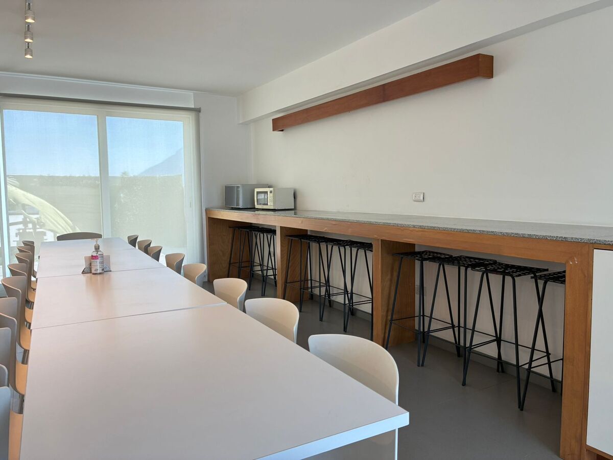 * Salas de trabalho em equipe com mesas redondas e quadro