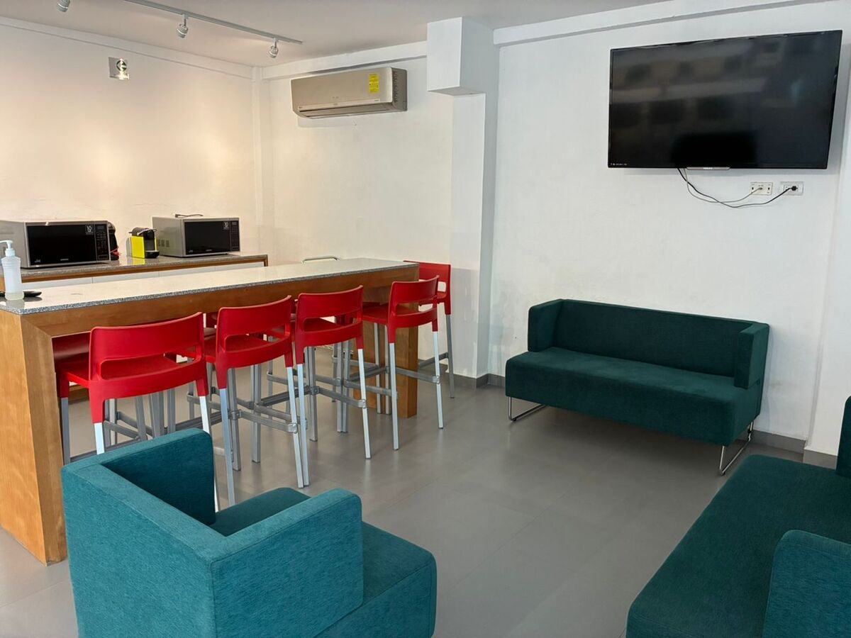 * Pequena cozinha equipada (geladeira, micro-ondas, pia).