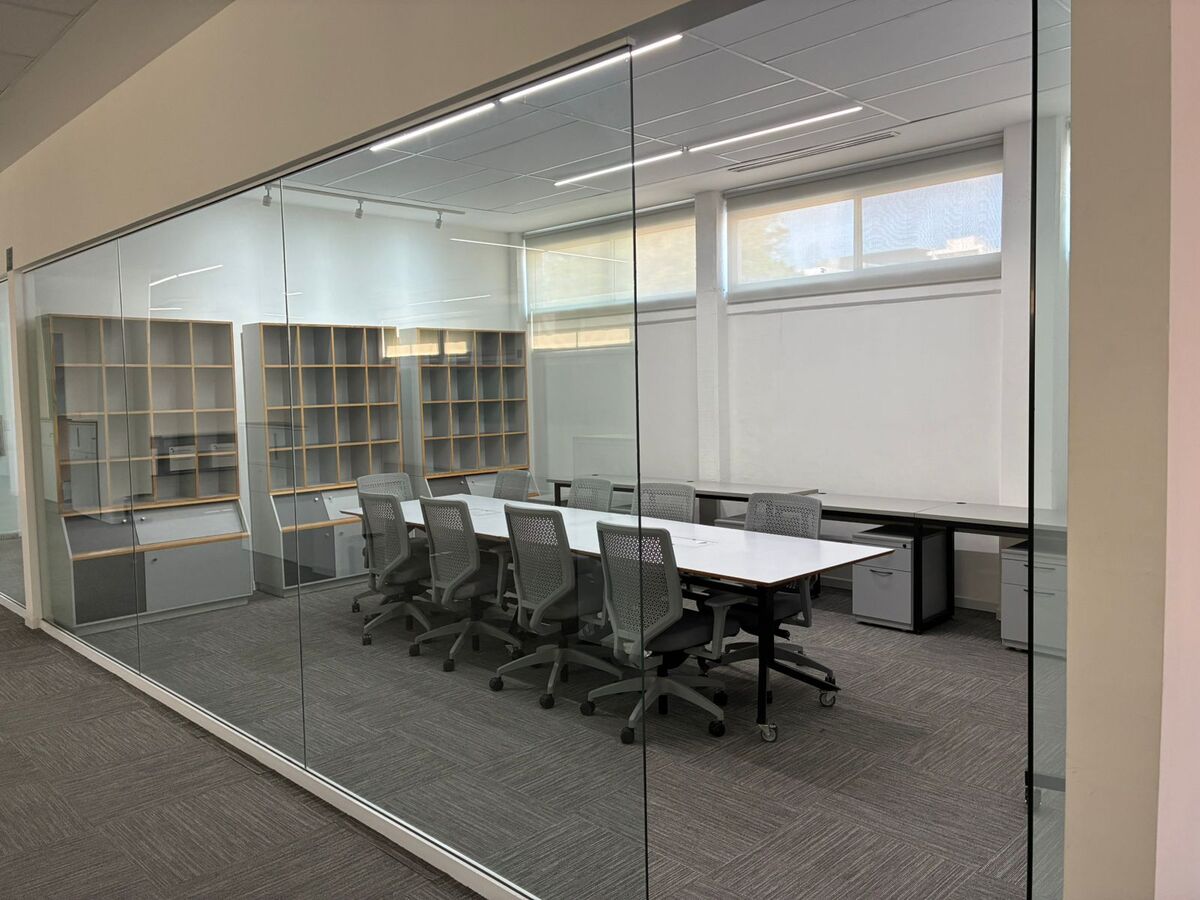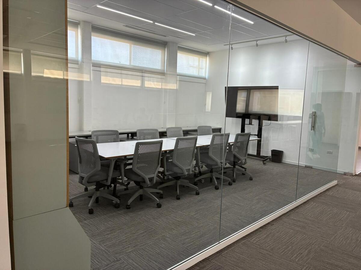 * Salas de trabajo en equipo con mesas redondas y pizarron
